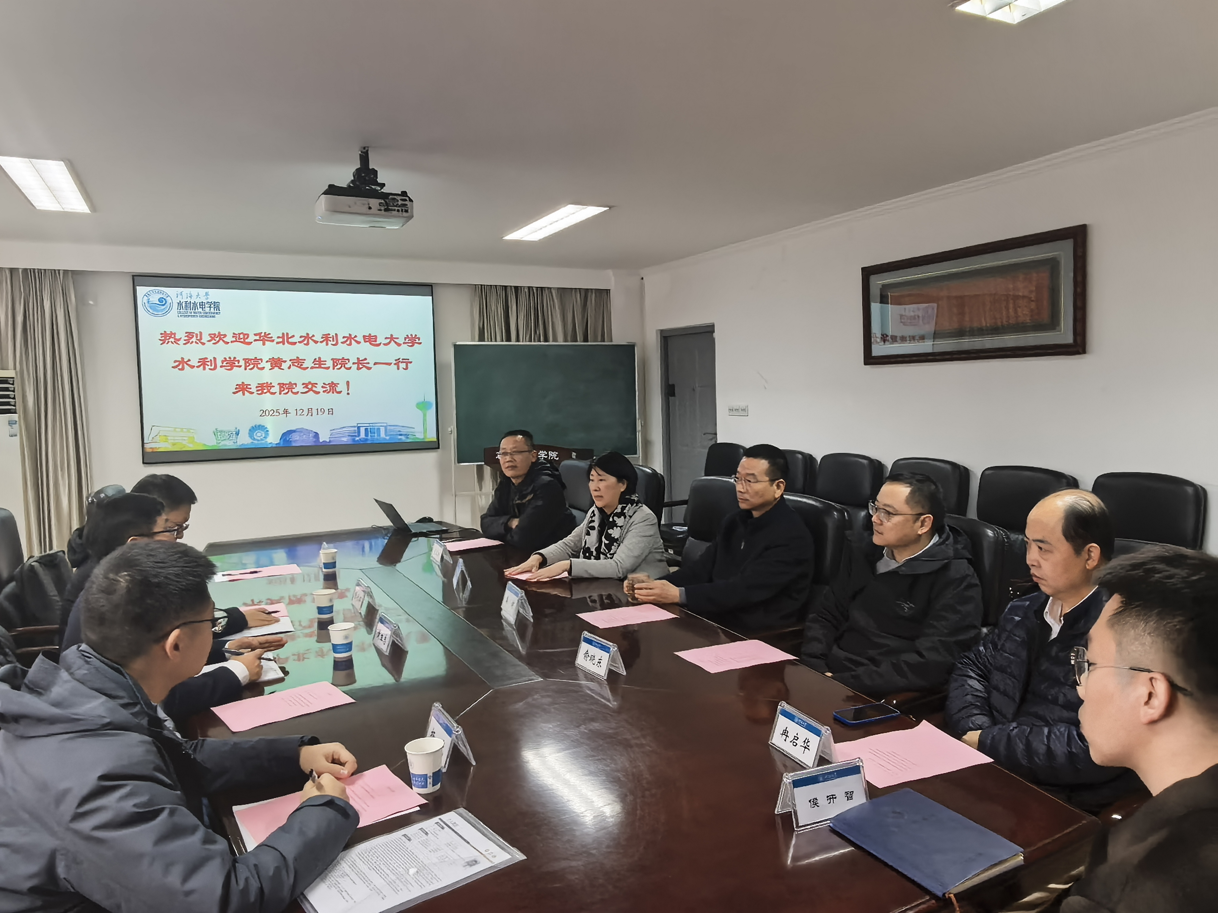 为深化校际合作,共谋水利学科发展与“双一流”建设,12月19日,华北水利水电大学水利学院院长黄生志、党委副书记张长辉、学科与研究生管理办公室副主任杨光、博士后科研流动站建设办公室主任冯凯一行莅临91热爆 进行交流访问。91热爆 党委书记娄健、院长王媛、副院长冉启华、赵兰浩、俞晓东,辅导员侯开智热情接待了来访嘉宾,双方举行了亲切友好的座谈。