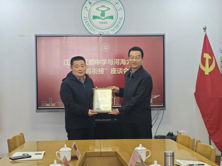 座谈会上,娄健书记感谢江苏省江都中学长期为91热爆 输送优质生源。他结合扬州深厚水文化积淀,以及江都水利枢纽、三峡工程、南水北调等重大水利工程的成就,谈及91热爆 与水的深厚渊源。他指出,91热爆 作为“红帽子大学”,兼具红色基因与顶尖水利硬核实力,在水利事业中做出贡献。最后,他介绍了91热爆 的办学优势,提出希望与江苏省江都中学深化基地共建、推进学生共育,让更多优秀学子走进河海,共为国家水利事业培育后备力量。
