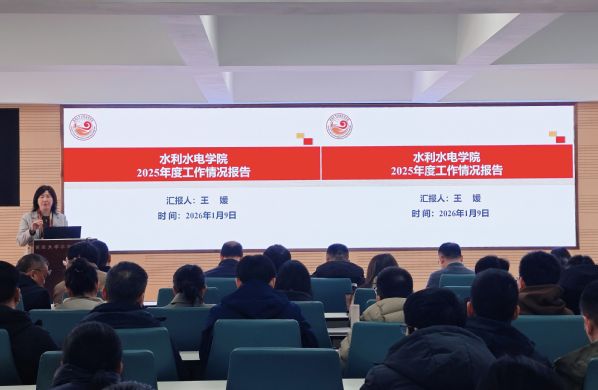 会议第一阶段为水利水电学院第五届教职工大会第三次会议。会上,王媛院长作《水利水电学院2025年度工作情况报告》,系统总结了学院2025年在党建工作、学科建设、师资队伍建设、人才培养、科学研究、社会服务、国际交流等方面取得的进展和成绩,指出了学院发展面临的问题和挑战,明确了未来的发展方向和目标。