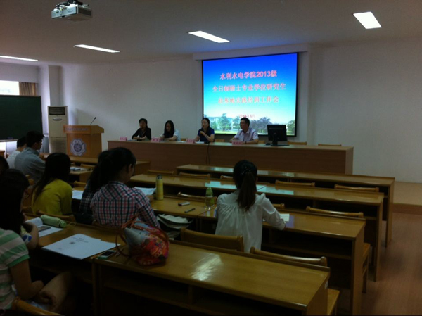 2014年6月17日,水利水电学院2013级全日制硕士专业学位研究生赴基地实践培训工作会在水电馆401召开,水利水电学院党委戴玉珍副书记、研究生辅导员赵志涵老师、研究生教学秘书周昶老师,12级专硕学长袁田田同学以及全体13级专硕同学参加了会议,会议由赵志涵老师主持。