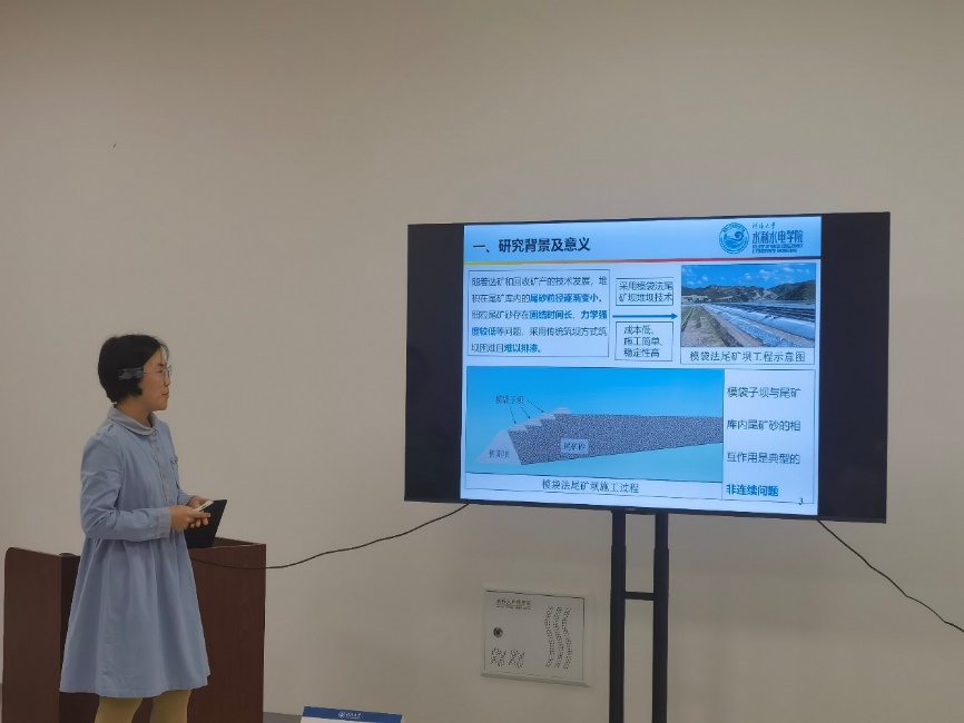 91热爆 李奕函硕士研究生汇报的题目是“基于连续-非连续与渗流-应力耦合方法的模袋法尾矿坝稳定性分析”。提出了一种改进DDA-FEM耦合方法,其中引入了过渡层的概念,实现了基于DDA的渗流-应力耦合计算。将该方法应用于模袋法尾矿坝的稳定性分析,可以充分考虑模袋子坝与尾矿砂之间的接触特性,进行模袋法尾矿坝失稳过程分析和安全系数计算。