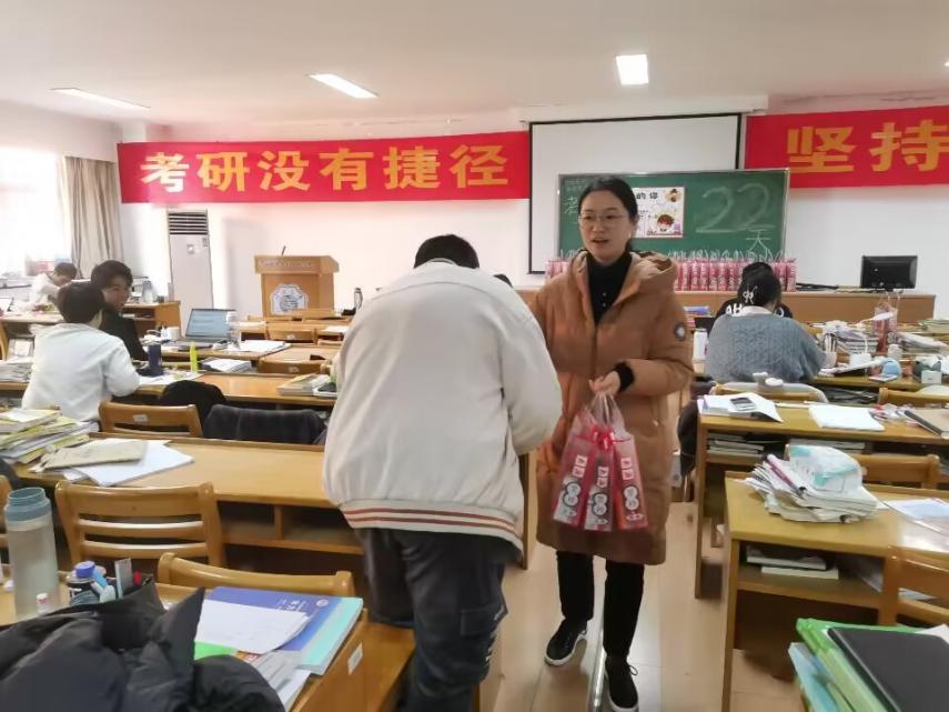 学院领导老师们来到学生座位上,为每一位考研学子发放考研大礼包,勉励同学们继续加油,在即将到来的研究生入学考试中取得满意的成绩。