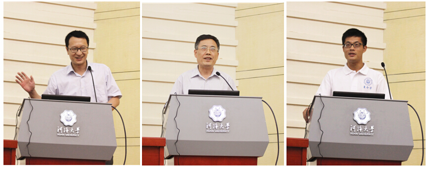 导师代表辛沛教授发言 张展羽书记致辞 研究生代表王甫发言 |