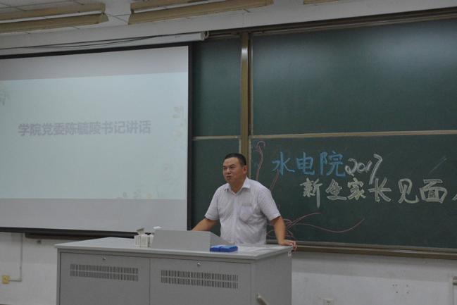 陈毓陵书记代表学院全体师生对新生家长表示热烈欢迎和衷心感谢与祝贺。陈书记介绍了学院悠久的办学历史和雄厚的办学实力,他希望通过学校、学院与家长的共同努力,把水电院的同学们培养成为国家的栋梁。