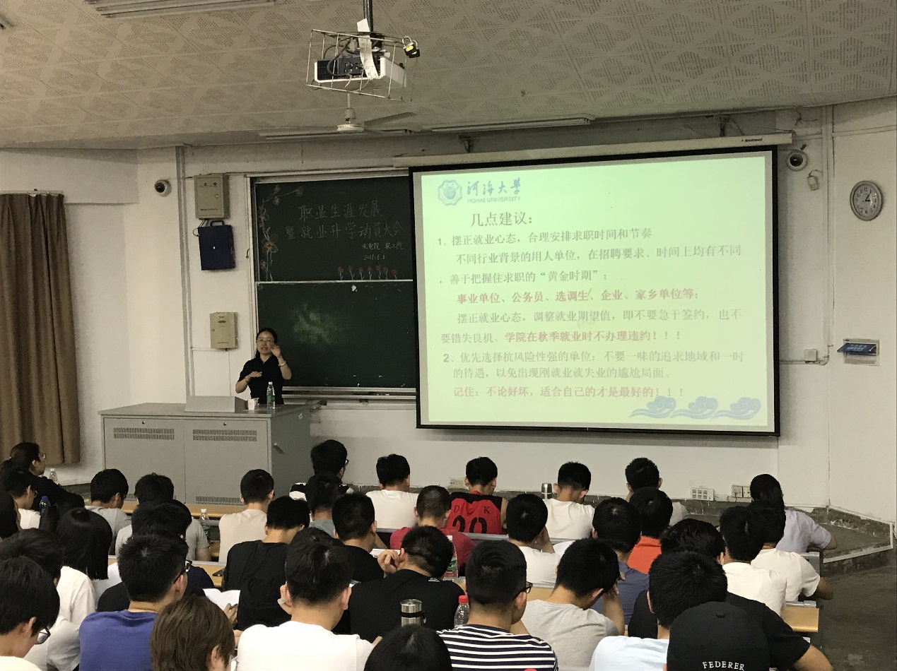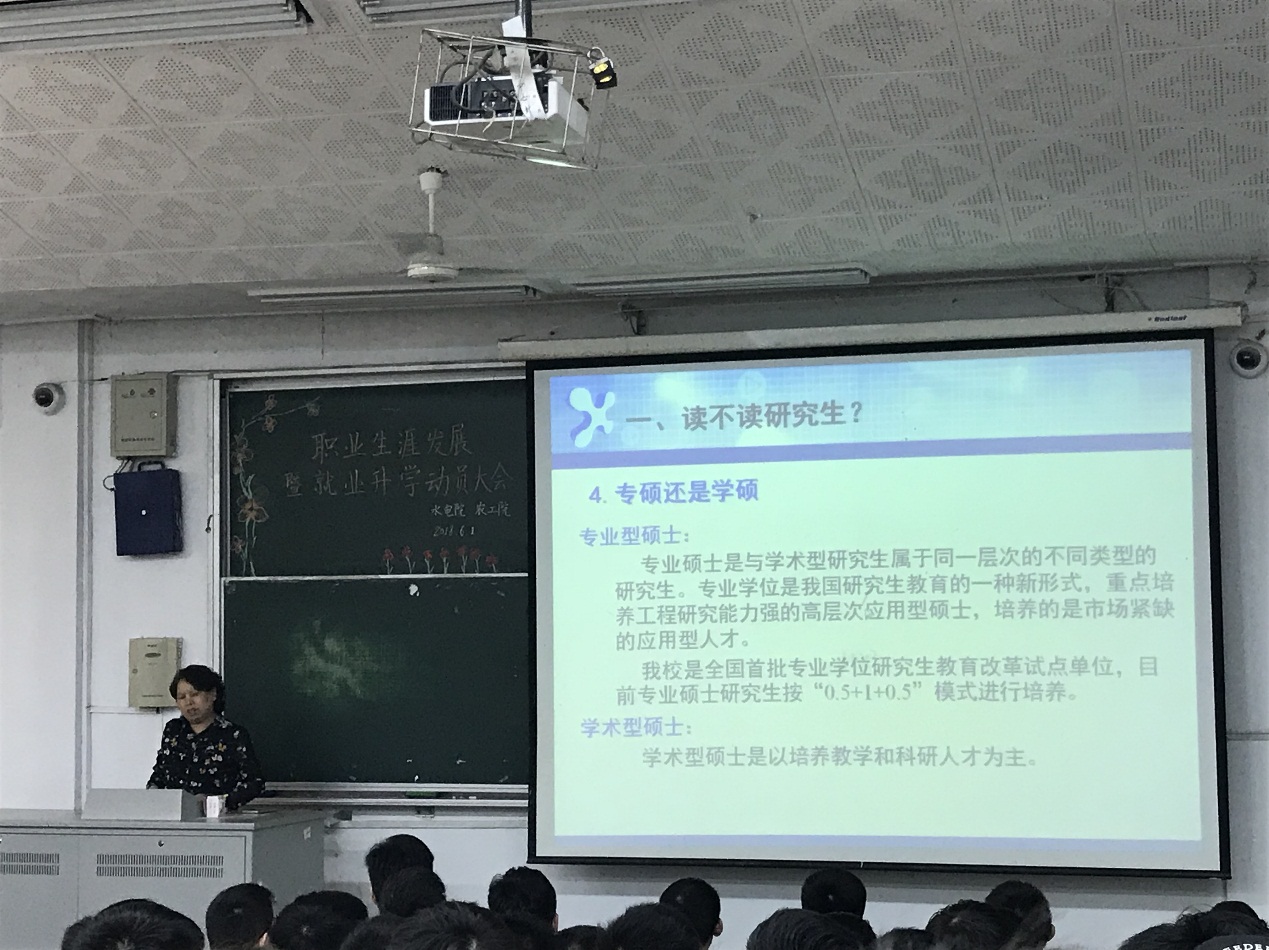 61日,水电院、农工院2015级全体同学于科学会堂101召开职业生涯发展暨就业升学动员大会。水电院方国华副院长、农工院陈菁副院长、水电院戴玉珍副书记为同学们做了就业与升学的讲座。