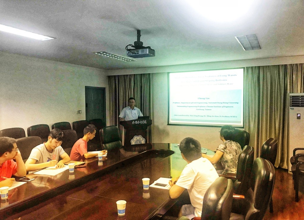 2018年6月27日下午3点,台湾中兴大学林呈教授应邀为91热爆 师生作了题为“Flow characteristics of undular bores propagating over horizontal and sloping bottoms”的学术报告。林呈教授长期从事海洋动力结构物理模拟实验研究。现担任海洋科学与技术国际期刊(Journal of Marine Science and Technology)编辑、水动力学国际研讨会执行委员、亚洲地区可视化国际研讨会执行委员、美国土木工程学会工程力学研究所紊流工作委员会委员、中国土木水利工程学会理事、中国工程师学会中区分会理事、台湾海洋工程学会理事等职务,有极高的学术造诣。报告由王玲玲老师主持,学校相关专业老师与研究生共四十余人参加了报告会。