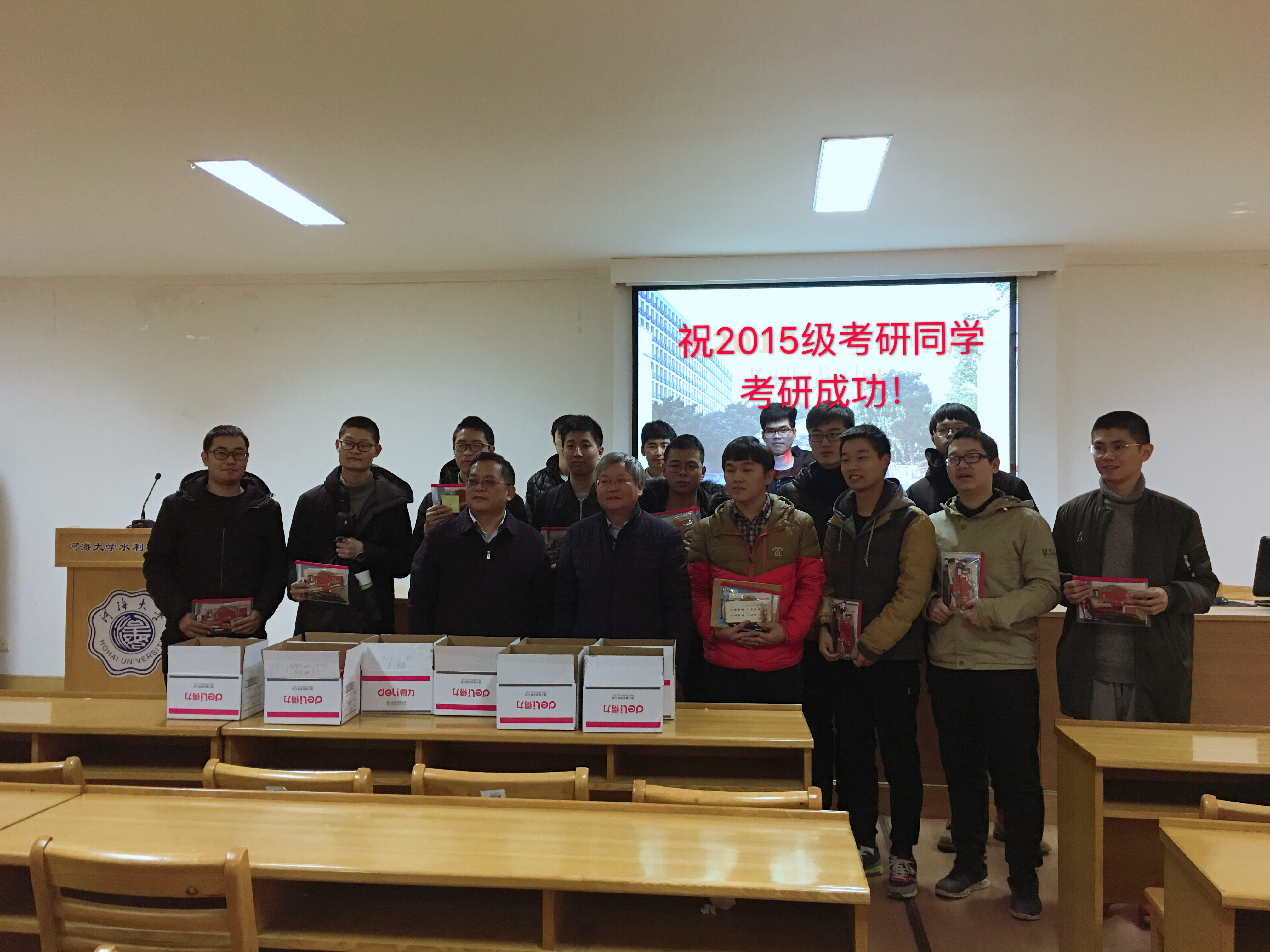 12月18日,学院院长顾冲时、党委书记任旭华、党委副书记戴玉珍,15级辅导员笪步源为2019届75名即将踏入研究生入学考试考场的同学送上温馨礼包。