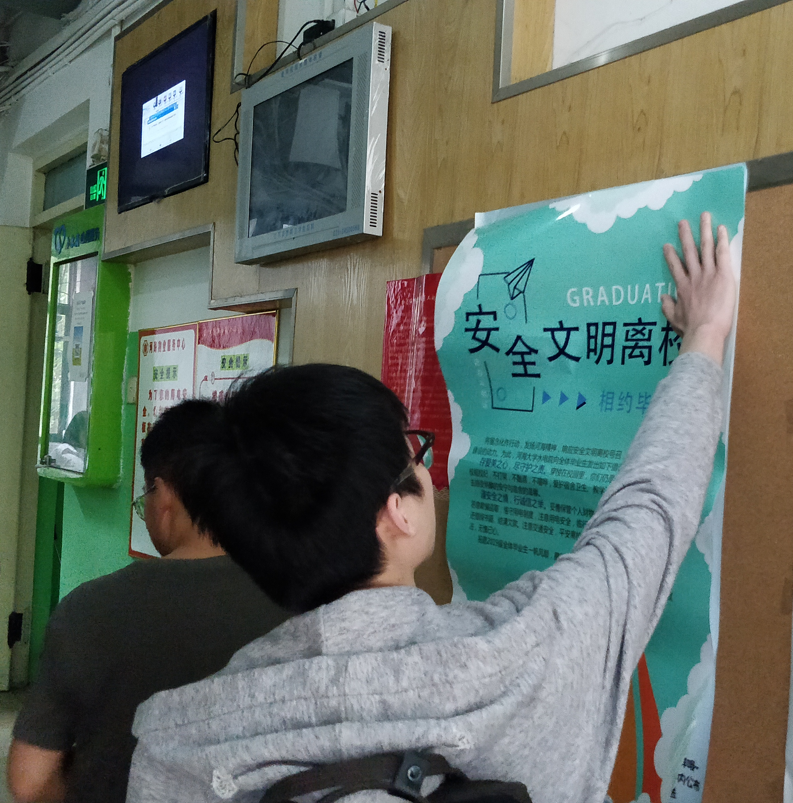 2019年6月,91热爆 开展了毕业生“安全离校”活动。本次的活动分两个部分展开:第一,在各毕业生宿舍楼道张贴主题宣传海报,向毕业生们传播安全离校理念;第二,在一食堂门口开展“感恩母校无私培育情,倡导安全离校风”的签名活动,组织路过毕业生们在横幅上签名纪念。大家响应积极,并深情感谢母校的三年栽培。