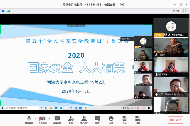 为提高大学生对国家安全的认识,建立一套理性的,符合时代特征和国家需求的教育框架,进而准确全面认识国家安全问题,树立正确的国家利益观。水利水电学院2019级的同学们以班级为单位,于2020年4月15日在线上开展了“同上一堂国家安全教育课”主题云班会,一起交流分享观看“同上一堂国家安全教育课”的感悟。