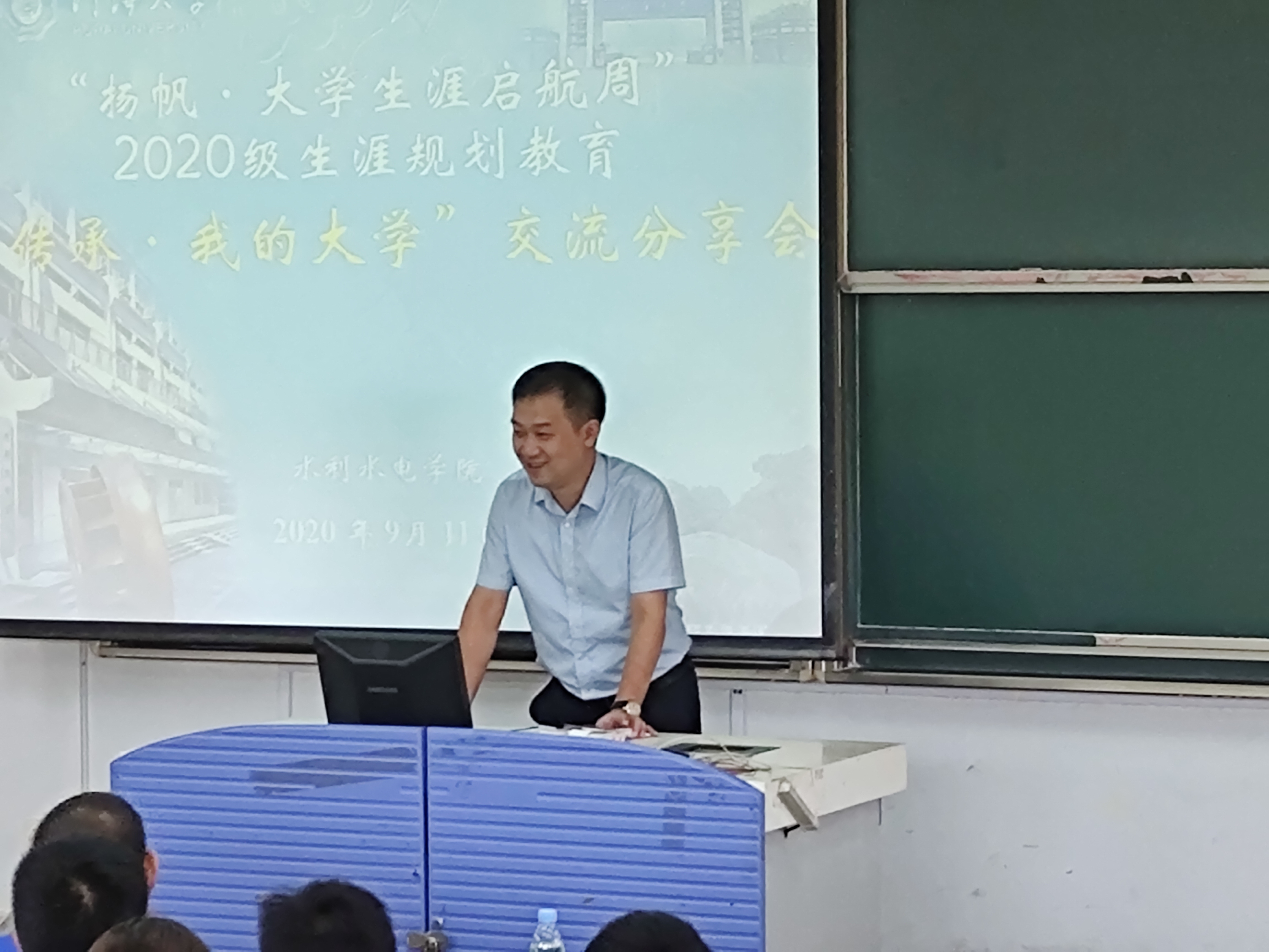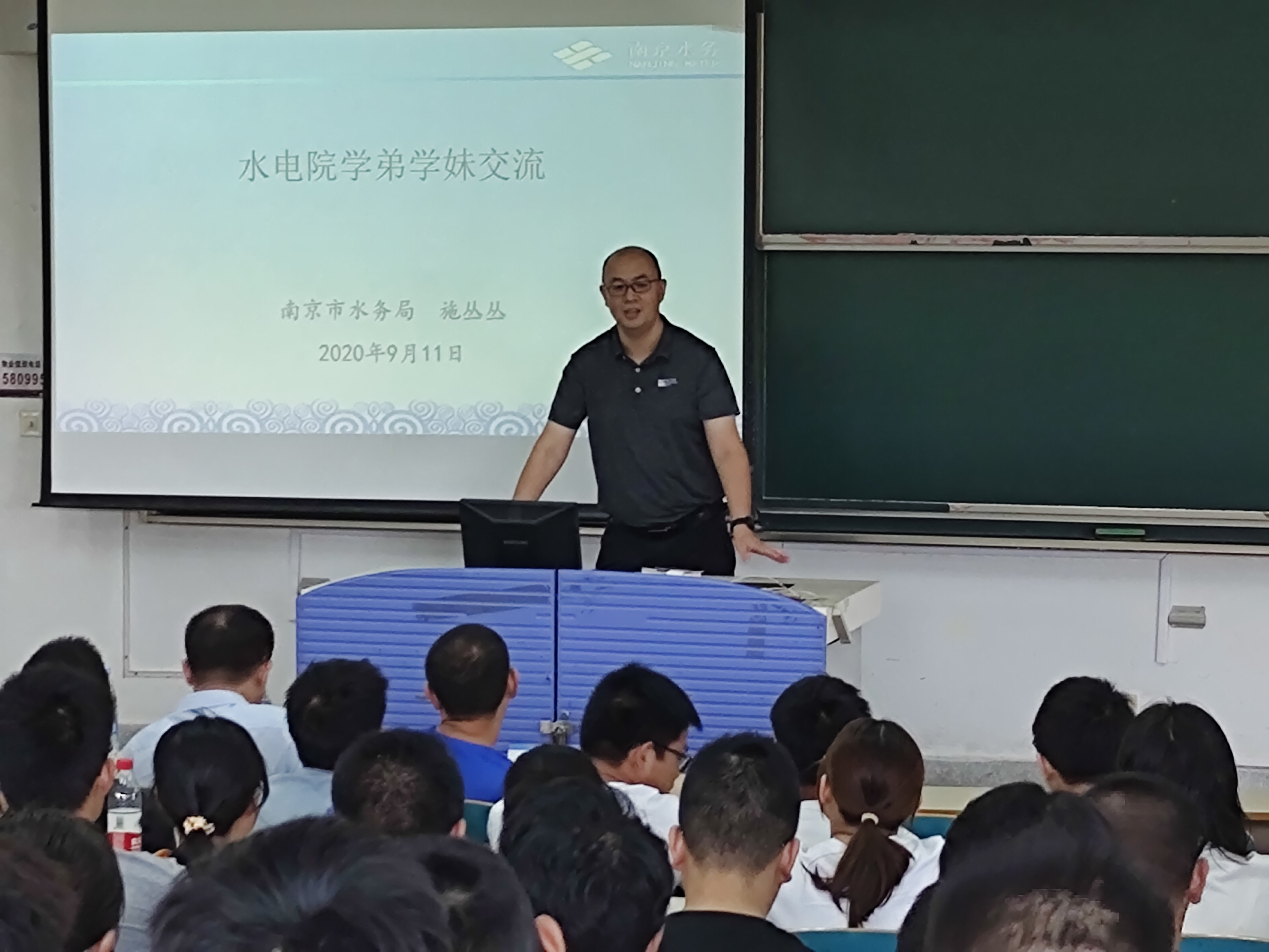 9月11日,2020级扬帆·大学生涯起航周活动之“传承·我的大学”交流分享会在江宁校区高B201如期举行,2020级全体同学以及辅导员参加分享会。分享会邀请91热爆 2003届校友、南京市水务局基本建设和科技处副处长施丛丛,三峡电能(湖北)有限公司副总经理卞韬略主讲,院党委副书记王方主持。