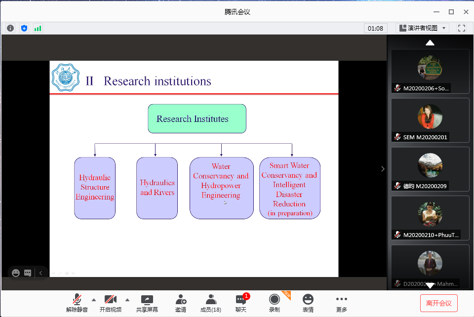 10月21日上午,水利水电学院举行了2020级留学研究生新生入学教育会线上会议。学院副院长方国华教授首先致辞,向各位留学生进入水利水电学院开始研究生阶段的学习表示祝贺和欢迎,希望留学生新同学热爱本专业,加强专业知识学习,在积累知识、运用知识、创新知识的道路上,学会发现问题和思考问题,逐渐从知识的积累者变成知识的运用者和创造者。学院国际合作与交流办公室主任周领教授从学院的学科概况、人才培养、国际合作等几方面为留学生们做了详尽的介绍。研究生教学秘书周昶老师就同学们关心的课程学习、导师安排等事宜做了解答。2020级留学研究生入学教育会圆满结束。
