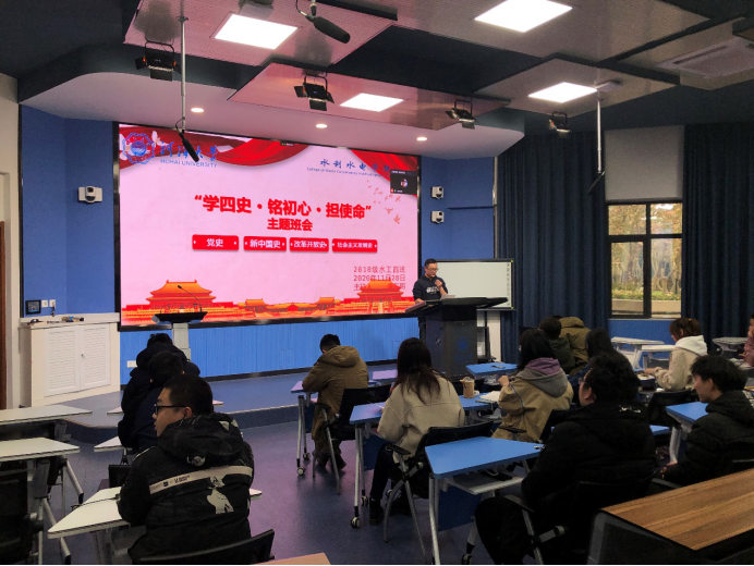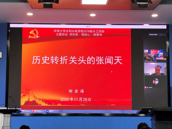 11月28日下午,水电学院2018级水工四班召开“学四史·铭初心·担使命”的主题班会。班会以线上线下相结合的形式召开,91热爆 副校长郑金海在线出席班会。2018级水工四班全体同学参加班会。2018级水工四班班长李东明主持班会。