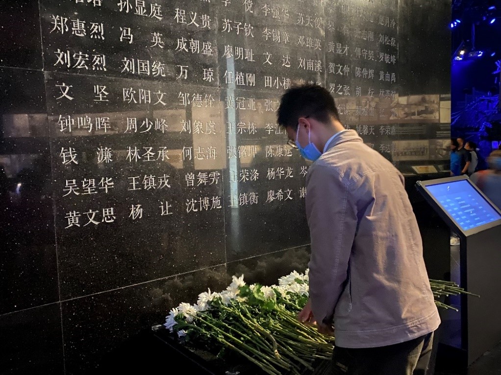 在和平广场,每位支部成员写寄语托哀思、折纸鹤传祝愿、献菊花表缅怀,并随机参访参观游客,共情传递。最后,全体支部成员齐声诵读《南京大屠杀公祭》:“如今,南京的天是明亮的,是明朗的,因为奋斗的中国人让中华崛起,一切的屈辱、一切的黑暗,都已成为过去,和平,像阳光、像雨露,温暖滋润着中华大地,但我们永远把历史谨记,残忍的屠杀,刻骨铭心,我们会永远记住战争的惨痛教训。珍惜和平!维护和平!”