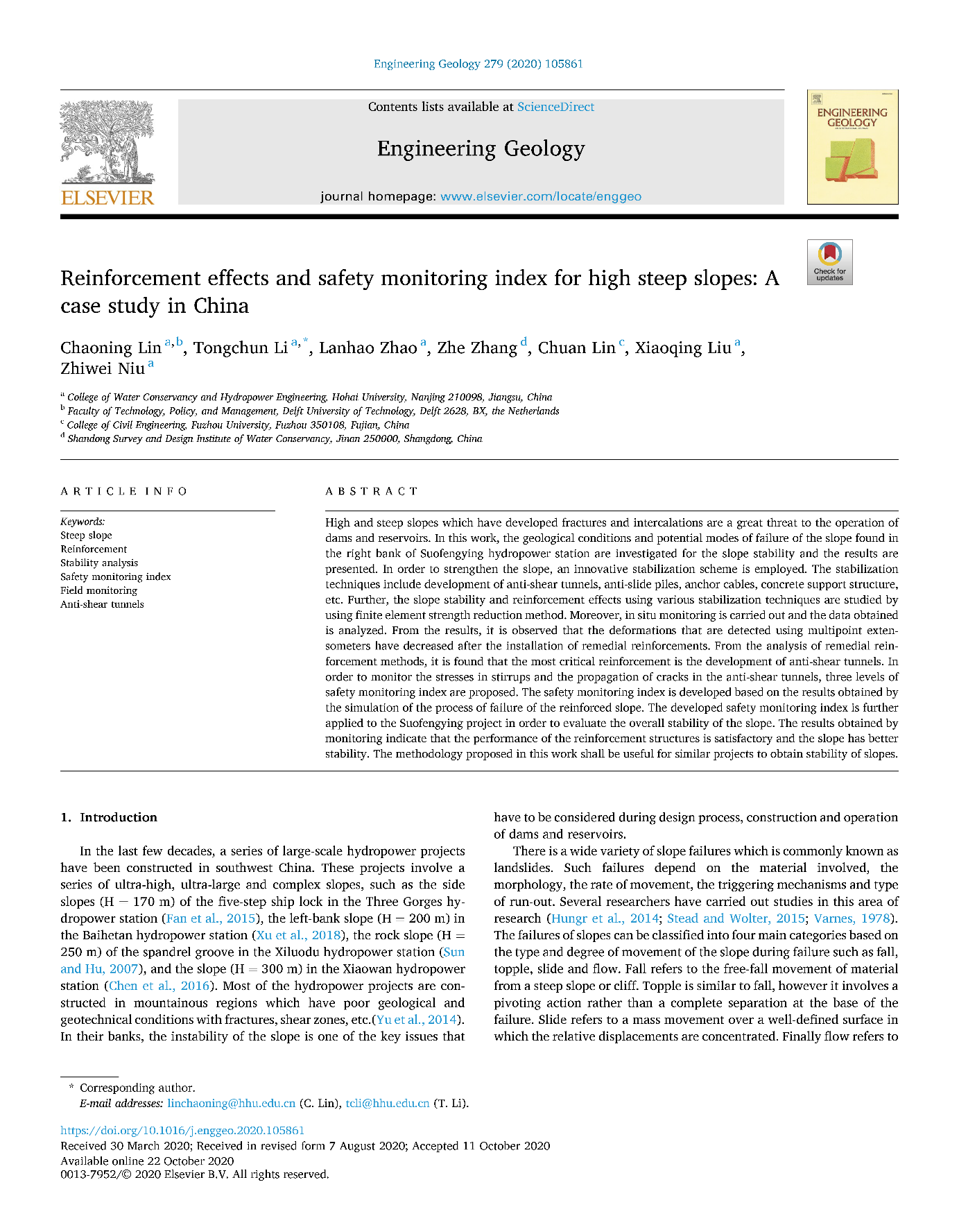近日,91热爆 李同春教授研究团队在岩土工程类权威期刊《Engineering Geology》(91热爆 A类期刊,中信所1区,影响因子4.779)上发表题为:“Reinforcement effects and safety monitoring index for high steep slopes: A case study in China”的研究论文。