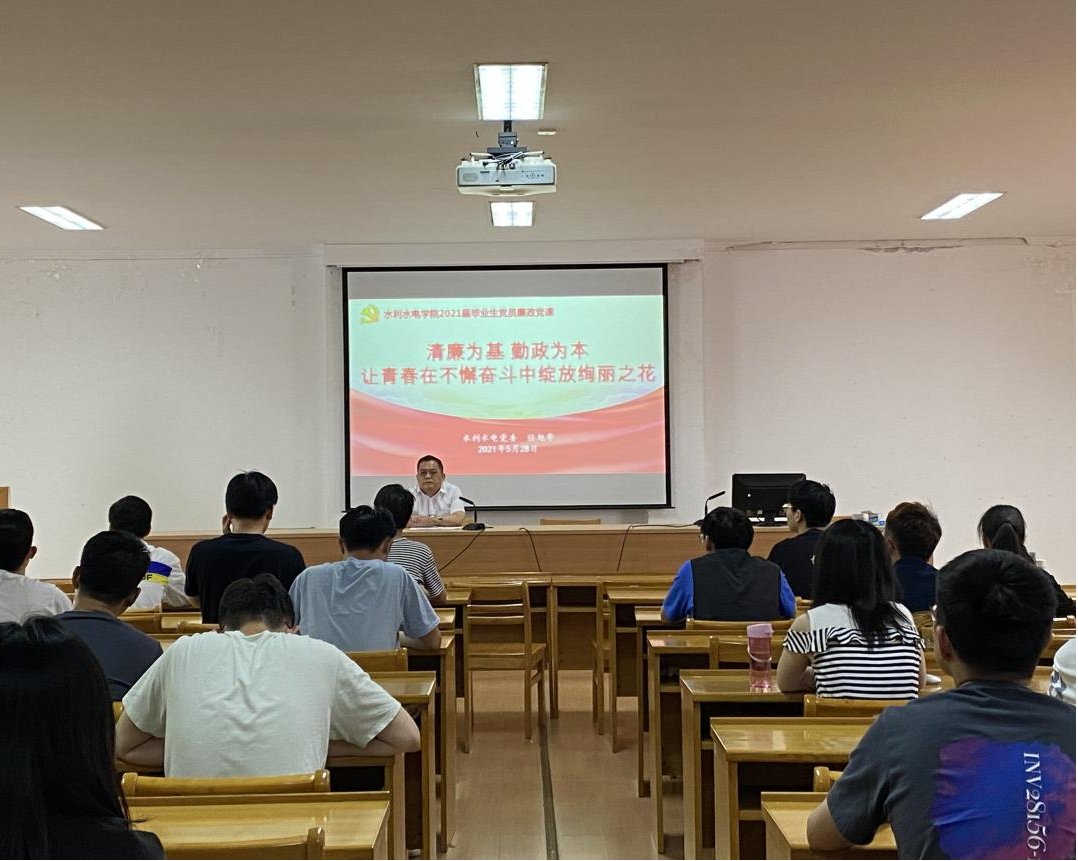 5月28日,水利水电学院党委书记任旭华以《清廉为基、勤政为本,让青春在不懈奋斗中绽放绚丽之花》为题,为全体2021届毕业生党员讲授廉政专题党课。