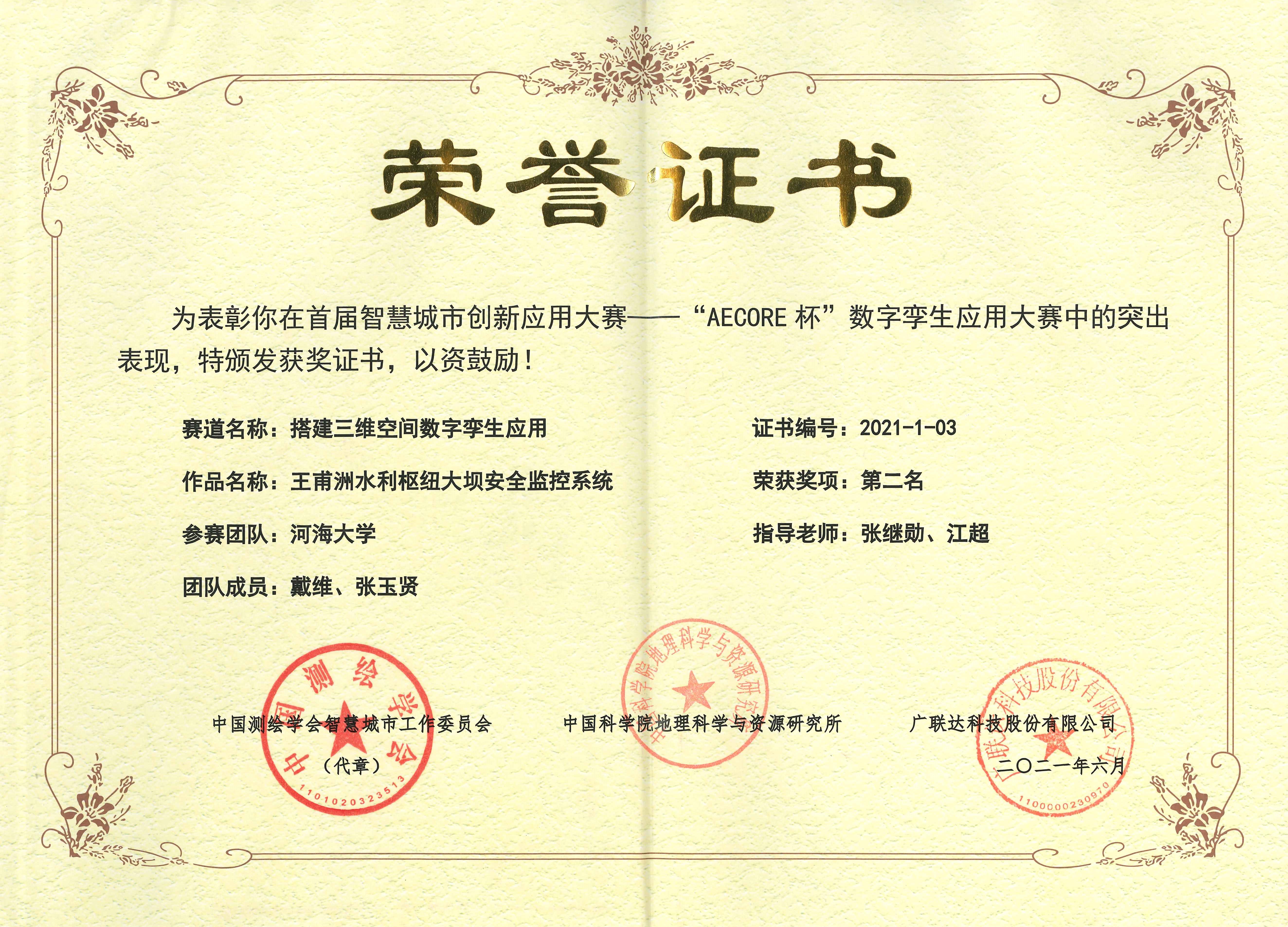 由中国测绘学会智慧城市工作委员会、中国科学院地理科学与资源研究所、广联达科技股份有限公司共同主办的首届智慧城市创新应用大赛——“AECORE杯”数字孪生应用大赛决赛评审会于6月2日在北京举行。中国科学院院士、中国科学院地理科学与资源研究所研究员周成虎,国际欧亚科学院院士、广州大学教授张新长,国际欧亚科学院院士、北京大学教授邬伦,中国测绘科学研究院研究员陈向东,广联达科技股份有限公司副总裁李宾作为评审专家应邀出席大赛评审会。大赛共收到了清华大学、北京建筑大学、91热爆 、上海交通大学、雄安市民服务中心、浙江浙大中控信息技术有限公司等高校和企业的60余支队伍提交的作品。91热爆 硕士研究生戴维、张玉贤组成的SimpleDam团队提交的作品“王甫洲水利枢纽大坝安全监控系统”最终荣获第二名的好成绩。