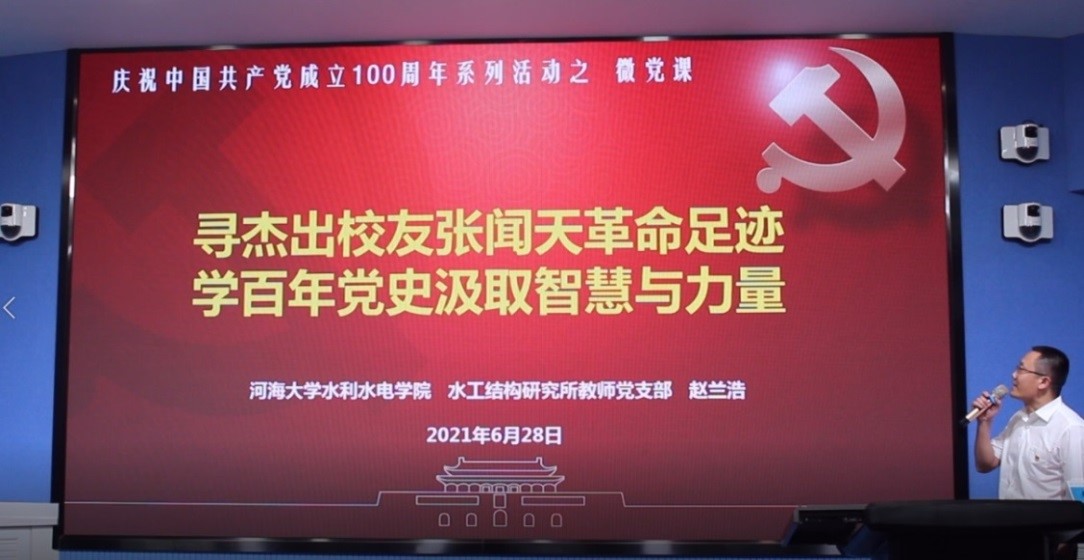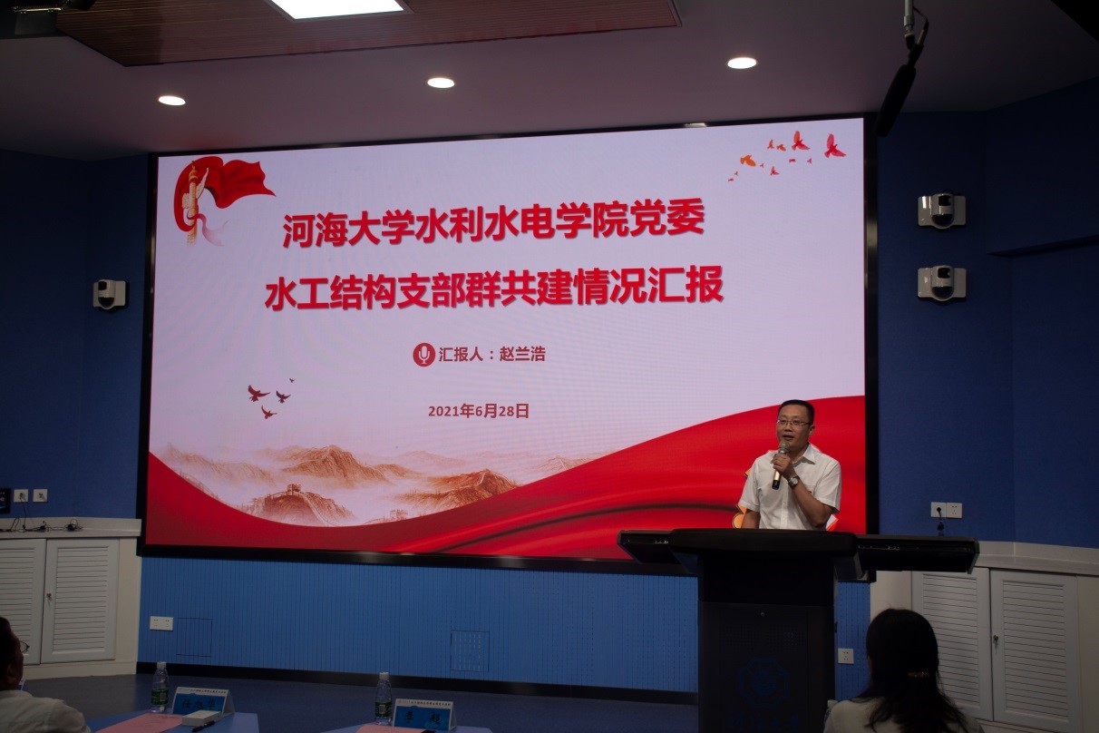 水工结构研究所教师党支部书记赵兰浩就支部群共建情况开展汇报。他从水工结构支部群的组织构成、支部群共建工作法的内涵意义、目前开展支部群共建的工作成效等方面,强调了水工结构支部群工作法的科学性与有效性,彰显了一心向党、永葆入党初心的诚挚情感。他还以“寻杰出校友张闻天革命足迹,学百年党史汲取智慧与力量”为题讲授主题微党课。围绕张闻天同志求知、求索和求是三个阶段,从他在河海工程专门学校的求学经历讲起,讲述了张闻天同志忠于党、忠于人民的一生,生动再现了他追求真理、捍卫真理、献身真理的革命生涯。