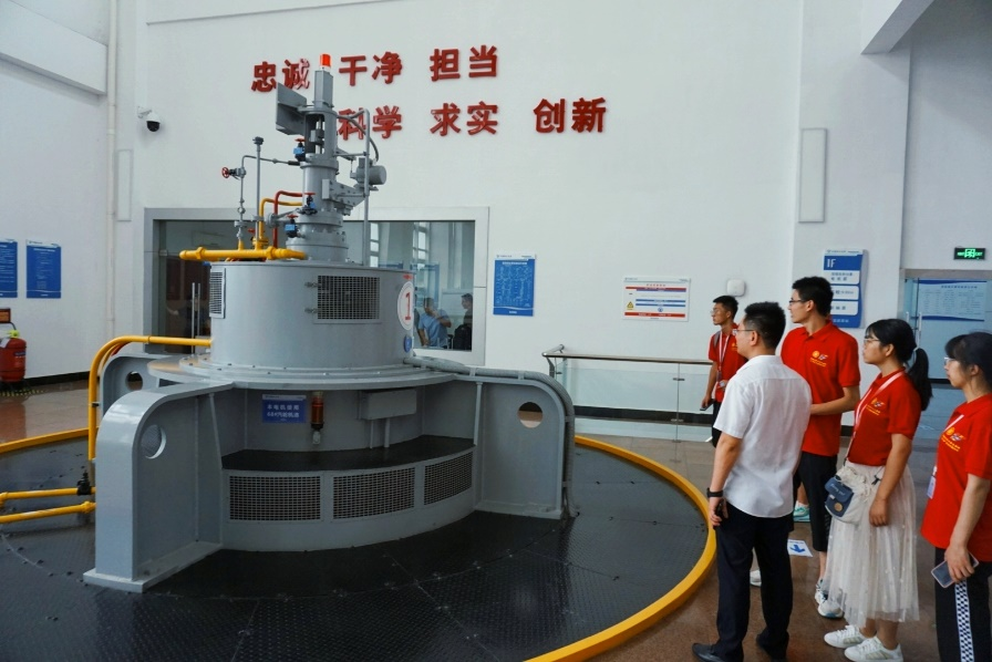 在宝应泵站,泵站所长带领实践团成员参观了站内的水利设施和机组部分,通过剖面图和实物观察,向实践团成员介绍了泵站机组的整体结构和工作原理,重点介绍了其中最重要的一个部分——真空控制阀。实践团成员还参观了泵站控制中心,系统的了解了泵站的工作原理。在室内文化走廊,工作人员介绍了南水北调东线工程和宝应泵站的建设情况。参观结束后,所长和实践团成员在党建活动室进行了进一步的交流和访谈。