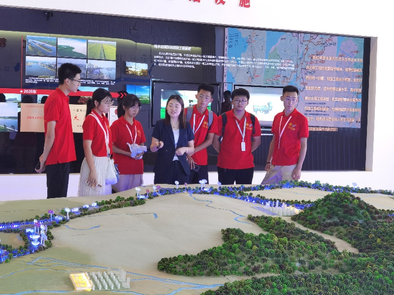 跟着总书记的脚步学党史,走进南水北调东线源头——江都水利枢纽。在这里,实践团成员来到南水北调数据中心,工作人员在展厅系统介绍了南水北调江苏段工程调水路线、建设历程和取得的巨大成绩。在参观学习中,团队成员了解到,数十万的建设者为了南水北调工程夜以继日的奋斗,还有无数百姓,心系国家发展,积极志愿移民,为东线工程建设做出贡献。参观期间,实践团成员就源头水质、调水方式、主要受水区域等问题与工作人员进行了交流,工作人员也就提出的问题进行详细的解答。