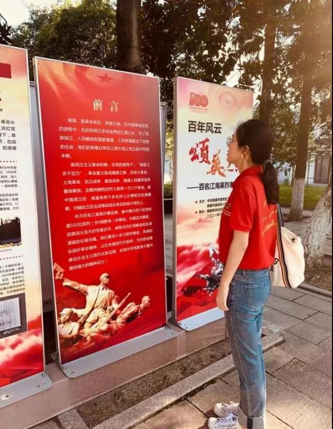 在海门区党校,与党校总负责人见面并交流后,实践团了解到海门区政府为庆祝建党百年,在党校内部场馆举办了党史图片特展,展馆内所陈列的展牌囊括了从“伟大开端”到“胜利的大会”等七个部分。实践团成员有幸在一名党校资深老师的带领下,参观了两大展馆,并得到了老师对于百年党史生动详细的讲解。