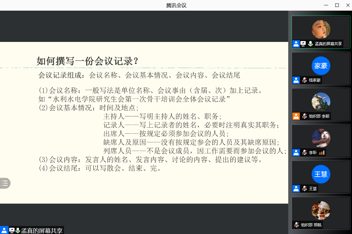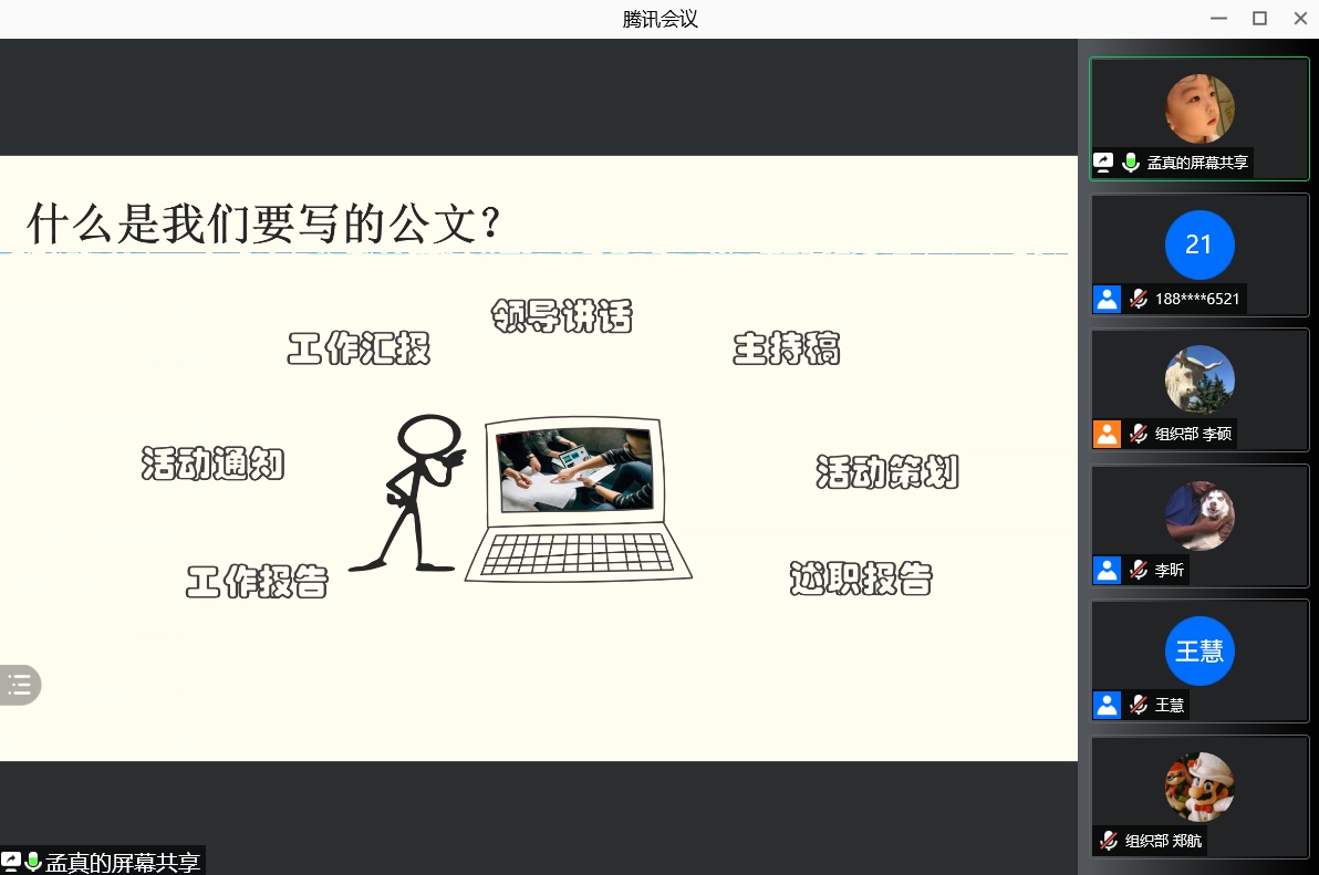 研会秘书处部长孟真向大家分享了学生干部公文写作经验。公文写作是学生干部的基本工作能力之一,公文可以实现上传下达、下情上报和沟通交流,提高研会工作效率,保障各项活动顺畅开展。