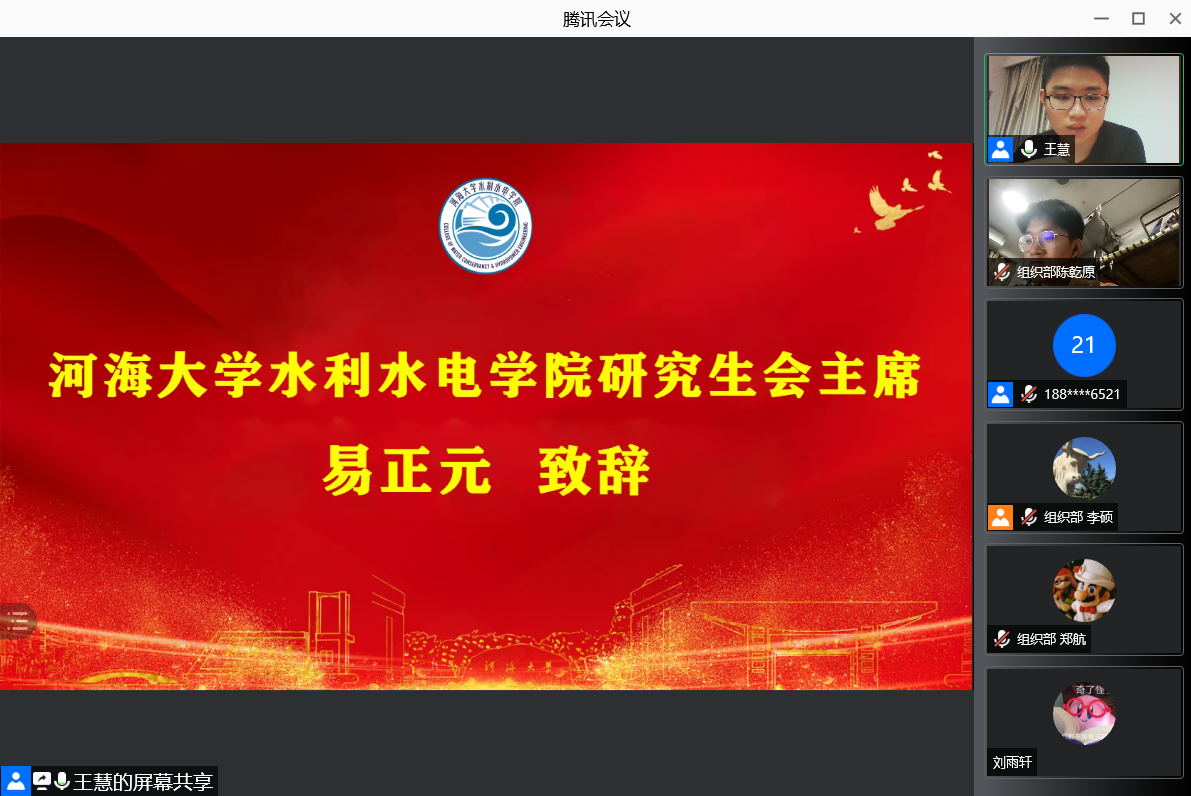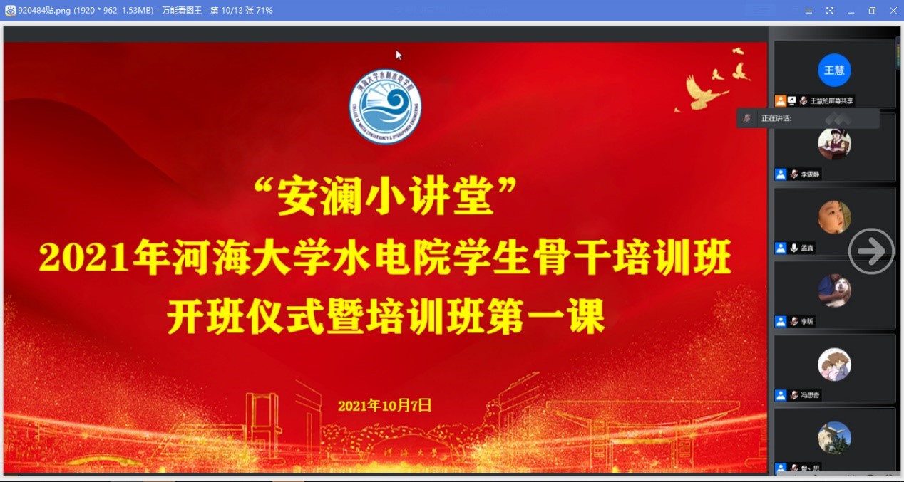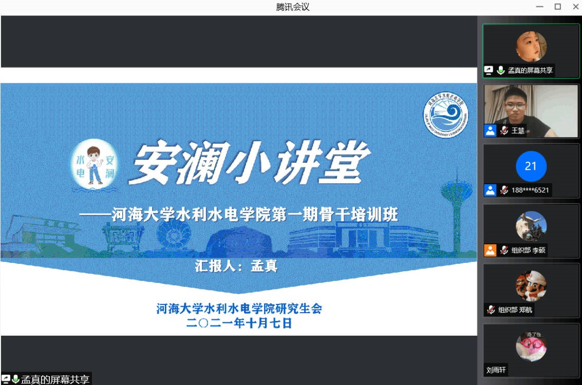 10月7日,“安澜小讲堂”——2021年91热爆 水电院学生骨干培训班开班仪式暨培训班第一课在线上召开。91热爆 研究生会主席团成员金子又、91热爆 水电院研究生会主席易正元、副主席高阳、冯思奇及部长团成员出席本次培训,水电院第十九届研究生会全体成员及第二十四届学生会部分成员参与本次活动,活动由秘书处王慧主持。