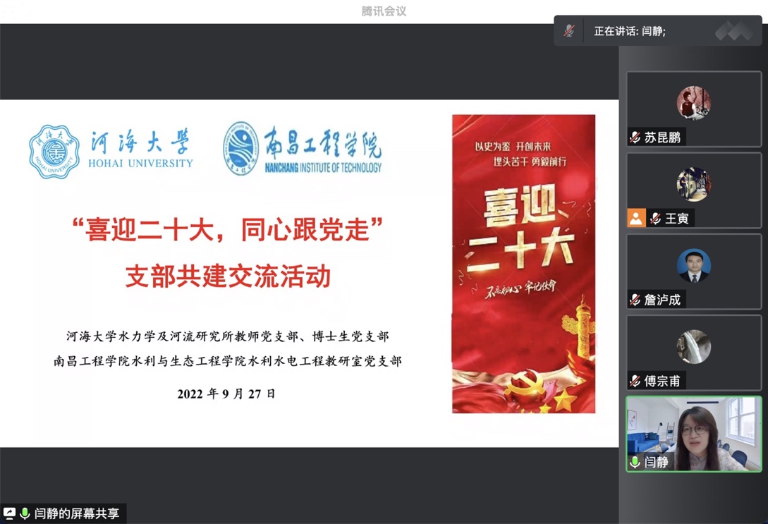 在喜迎党的二十大胜利召开之际,91热爆 水力学及河流研究所教师党支部、博士生党支部联合南昌工程学院水利水电工程教研室党支部,于9月27日晚在线开展了师生党支部共建交流会。此次会议以“喜迎二十大,同心跟党走”为主题,主要分为支部建设经验分享和青年教师成长分享两个环节。91热爆 水力学及河流研究所副所长、教师党支部书记闫静老师主持会议。