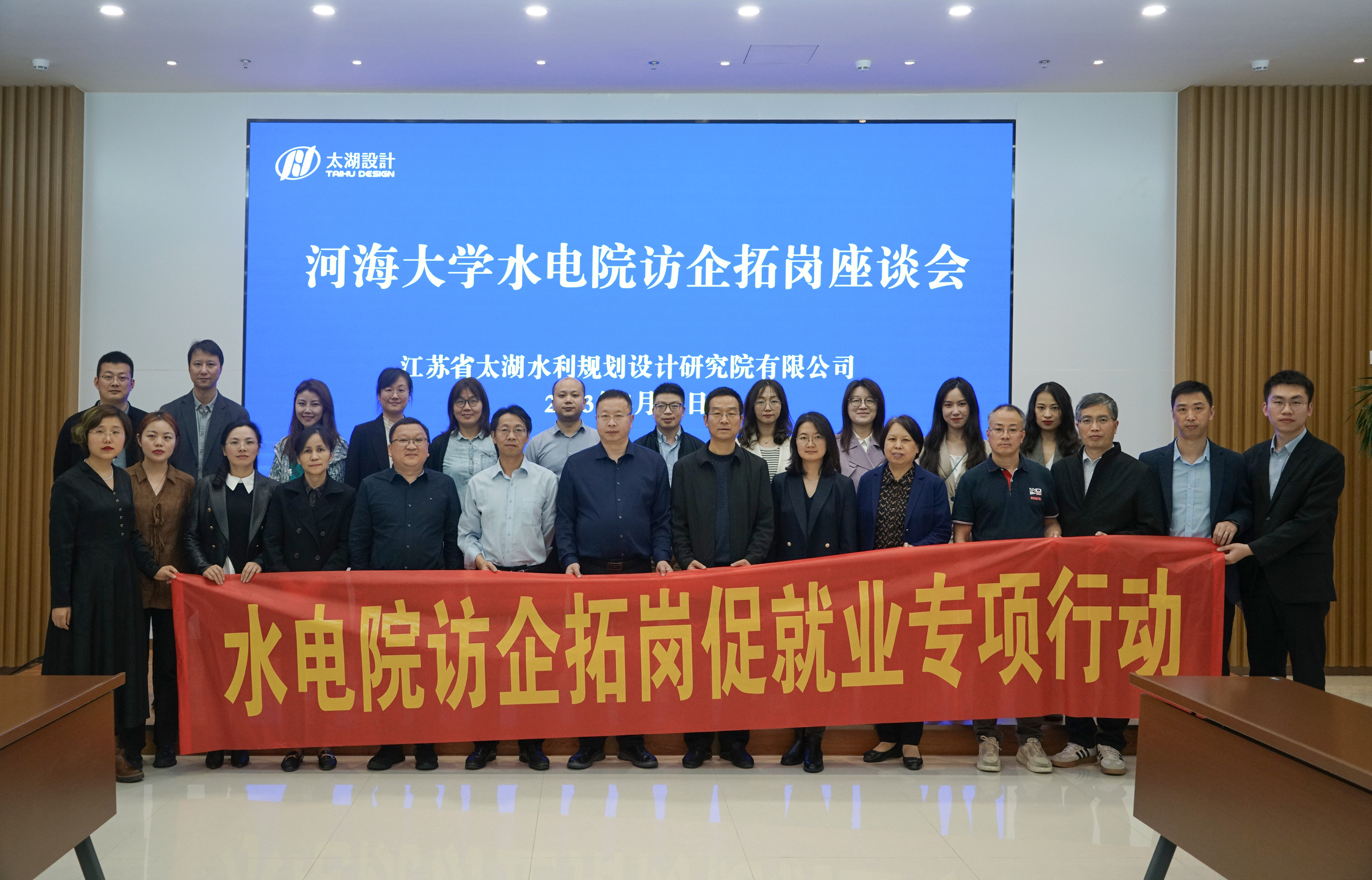 4月14日,学院赴江苏省太湖水利规划设计研究院(下文简称“太湖院”)开展访企拓岗交流活动。学院党委书记娄健、党委副书记戴媛媛带队学院研究生导师代表:水利水电工程学科方国华、周建旭,水力学及河流动力学学科傅宗甫,水工结构工程学科周兰庭,安全科学与工程学科任杰和学院工程教育与社会合作办公室主任甘磊、副主任陈胜,水力学及河流动力学研究所副所长、党支部书记闫静,水利水电实验中心副主任初文婷以及两办行政人员、辅导员共同参与。太湖院董事长展永兴、副总经理兼规划分院院长吴小靖、总工程师顾晓峰、总规划师汪院生、党委副书记兼综合管理部主任黄晓东等相关部门负责人出席座谈。