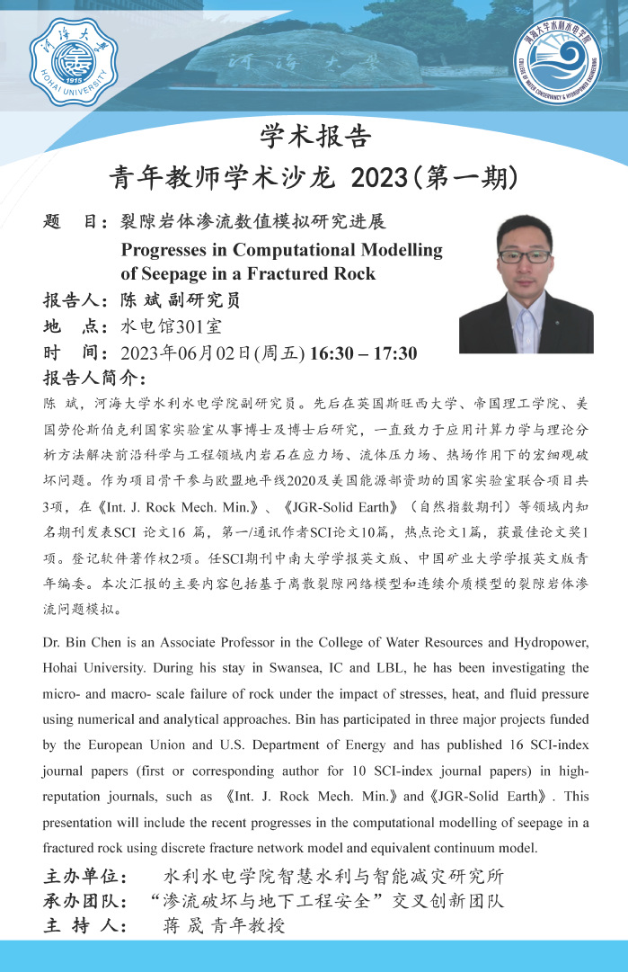 学术报告会 | 青年教师学术沙龙2023(第一期)裂隙岩体渗流数值模拟研究进展