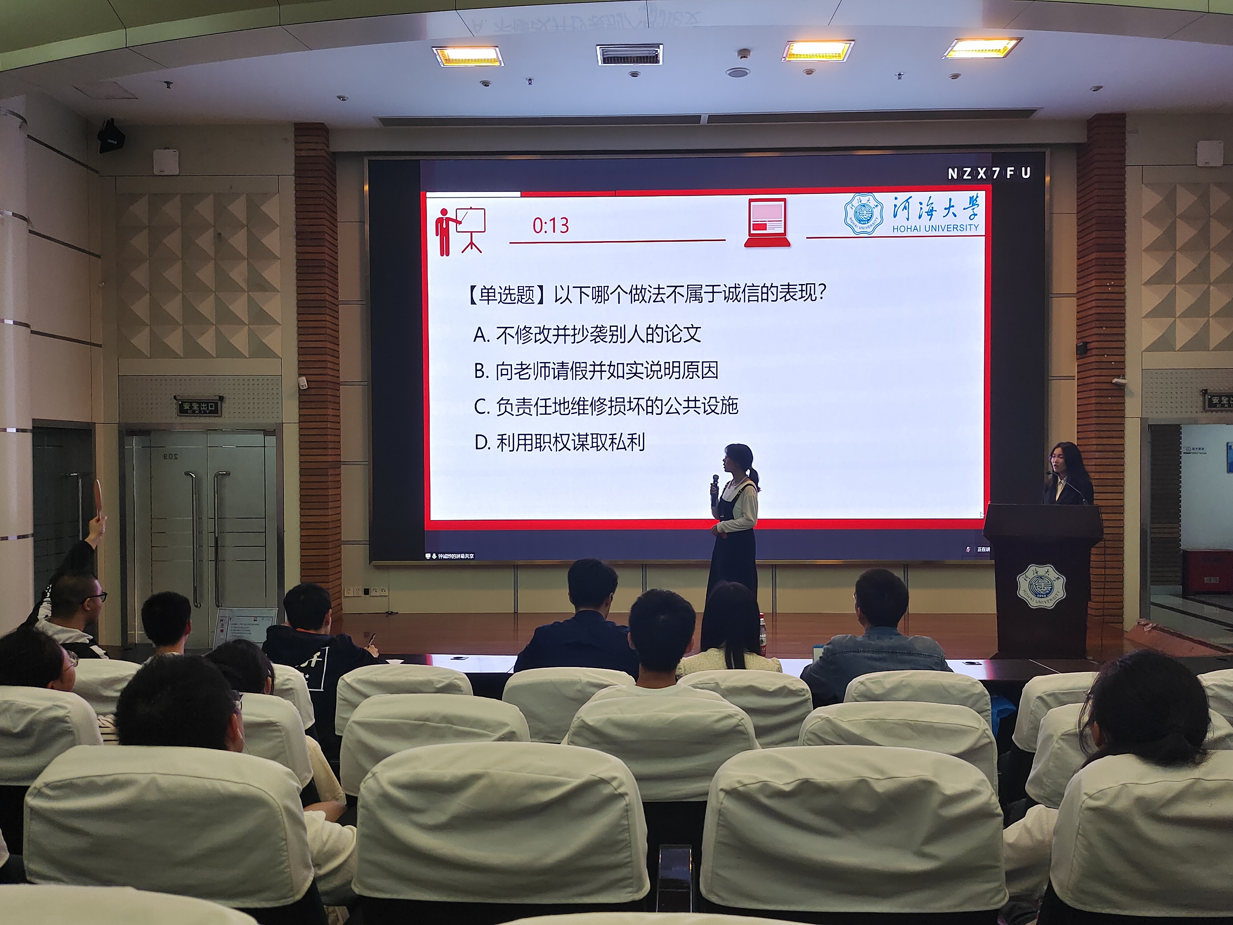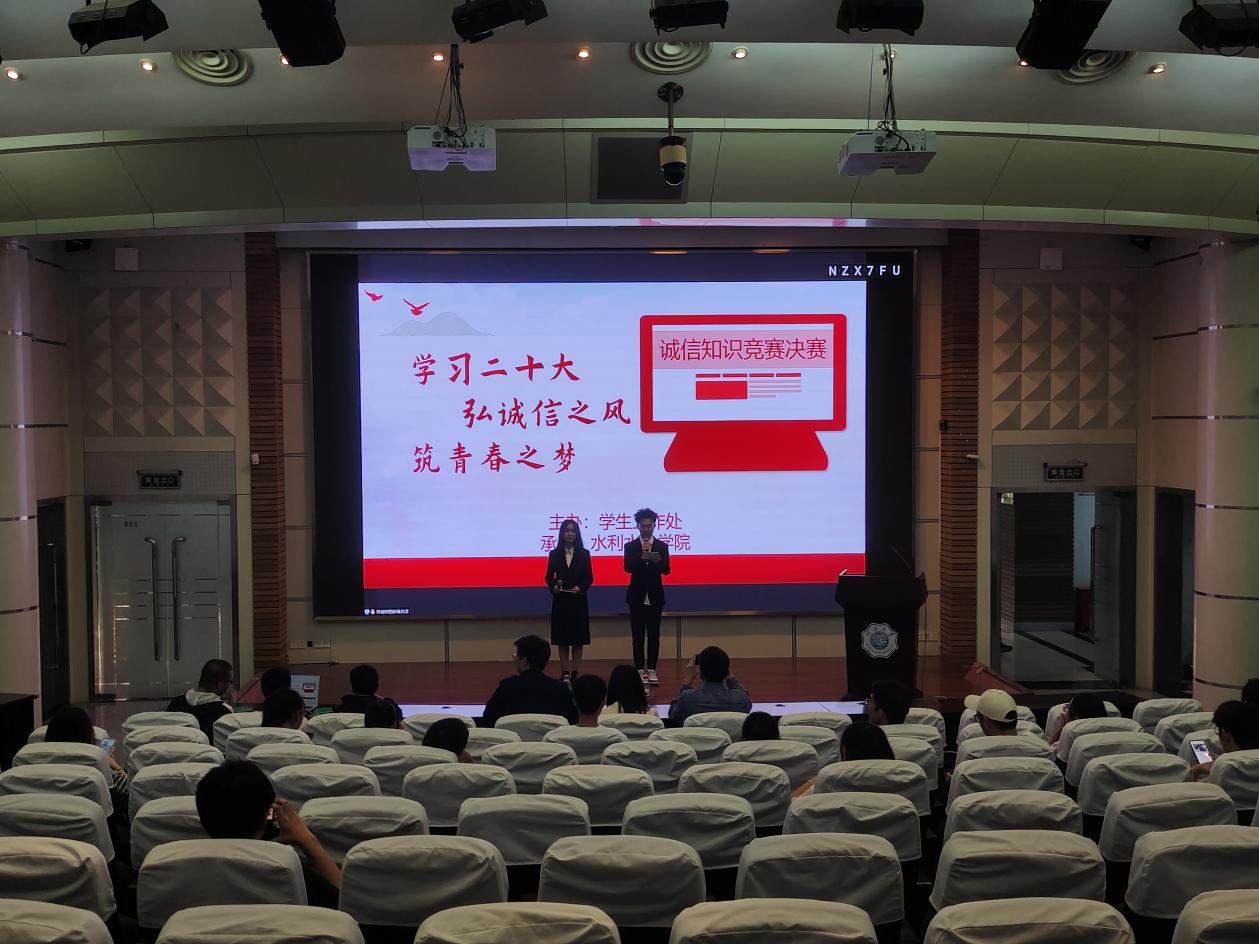 为认真学习贯彻习近平新时代中国特色社会主义思想和党的二十大精神,结合学校“诚信·励志·感恩”主题教育月活动的相关安排,由校学生工作处主办、水利水电学院承办的“学习二十大,弘诚信之风,筑青春之梦”诚信教育知识竞赛决赛于江宁会议中心举办。本次活动邀请土木与交通学院2021级辅导员韩新禹、公共管理学院2021级辅导员张睿宸与水利水电学院2021级辅导员侯开智担任评委,共有来自19个学院的180余名同学参加。