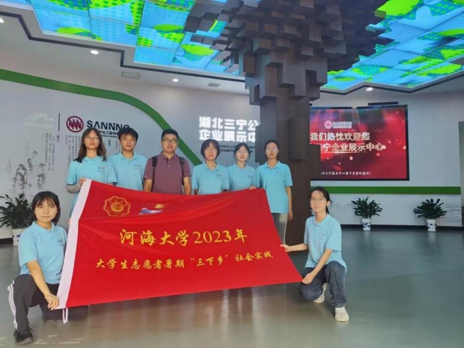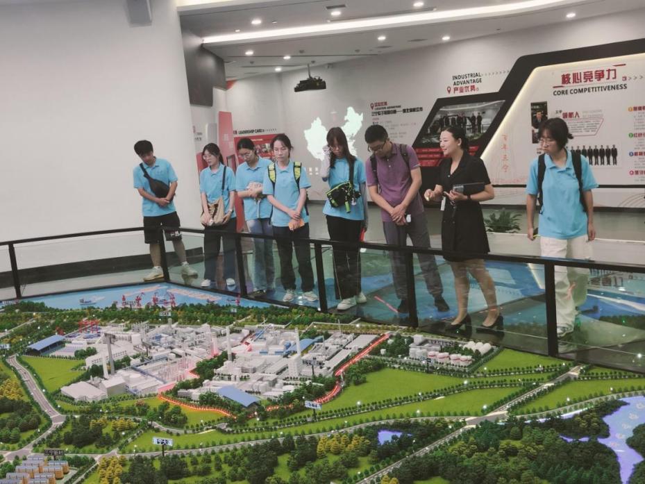 在三宁化工,工作人员带领实践团成员进入企业展示中心,向团队成员展示了三宁化工的百年发展历程,并详细介绍了企业组织机构、产品研发成果及经营业务范围等内容,特别强调了公司作为枝江市龙头企业积极响应国家“长江大保护”政策进行的一系列措施。