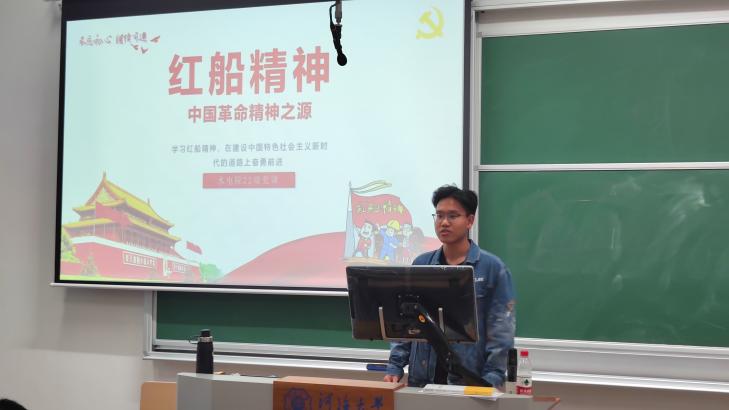 秀水泱泱,红船依旧。年级团支书周灵江对同学们开展红船精神党课。他提到,从小小红船到巍巍巨轮,一代又一代中国共产党人秉持着红船精神,为实现中华民族伟大复兴前赴后继、英勇奋斗。他在党课中强调了“红船精神”形成的历史渊源、红船精神的内涵为:开天辟地、敢为人先的创精神;坚定理想、百折不挠的奋斗精神;立党为公、忠诚为民的奉献精神,以及其对中国共产党的重要意义。