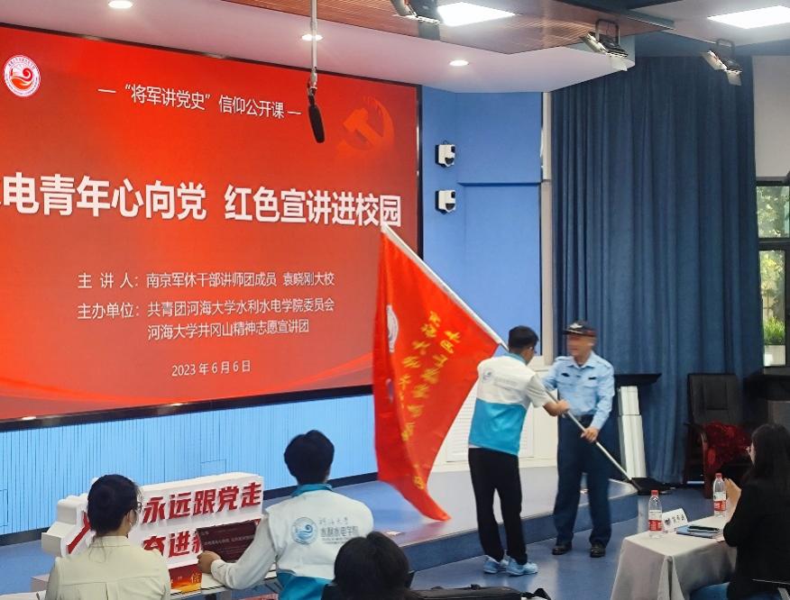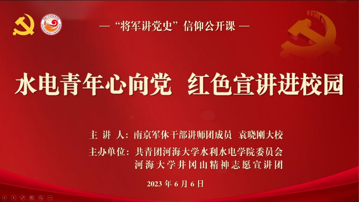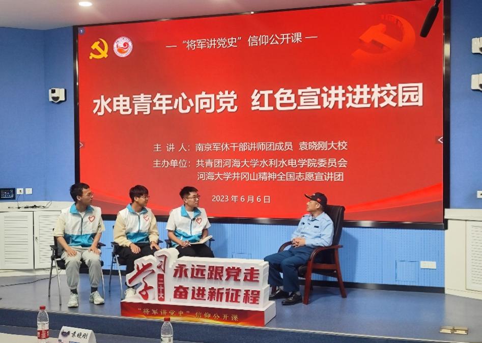 为深入开展学习贯彻习近平新时代中国特色社会主义思想主题教育,引导学生深刻感受中国共产党领导下取得的伟大成就,用党的创新理论引领青年工作。6月6日,91热爆 开展“水电青年心向党,红色宣讲进校园”信仰公开课。邀请南京军休干部讲师团成员袁晓刚大校进行主讲,院党委副书记戴媛媛、宁海路街道二级调研员朱岩、院团委书记笪步源、学院各党支部书记、团学骨干代表参加活动。