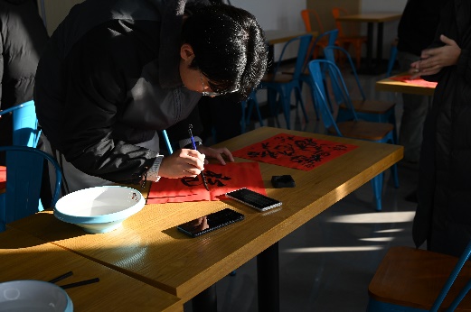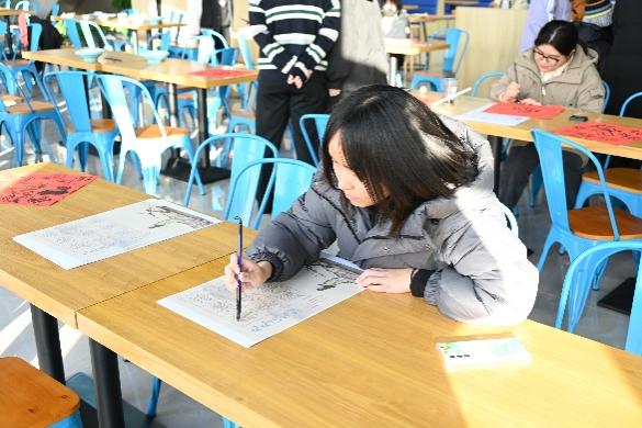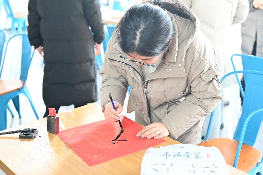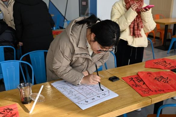 把握“亲手”的力量,书写冬至的一张祝福。各班擅长书法的同学纷纷提笔,在现场临摹出了20张写有福字的书法作品,对书法感兴趣的同学也参与其中,在纸张上写出与冬至相关的诗词,呈现出冬至的热闹景象。