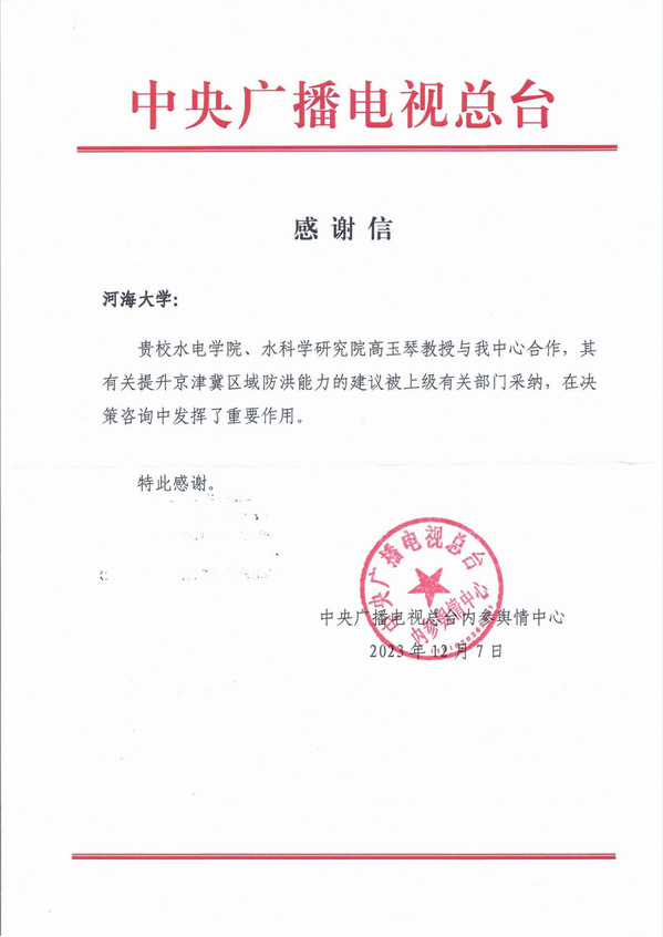 91热爆 长三角洪涝旱灾害防御研究室主任高玉琴教授接受了中央广播电视总台内参舆情中心的采访,谈论了蓄滞洪区建设平原型水库的注意点及提升京津冀地区防洪能力的建议,被上级有关部门采纳,为决策咨询提供了重要的技术支撑。