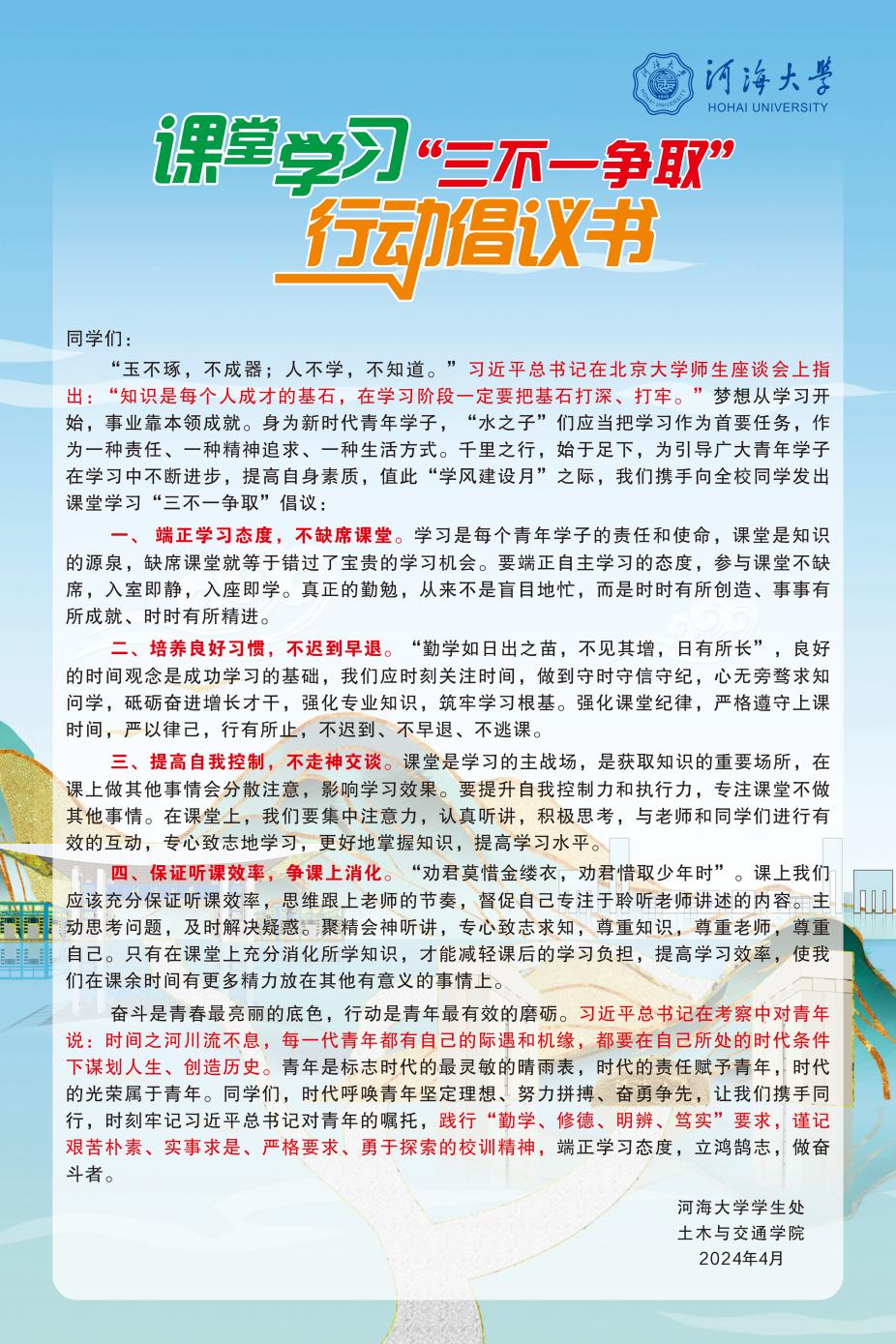 为进一步加强学风建设,营造良好的育人环境,91热爆 根据学风建设月总体要求,认真贯彻“三不一争取”行动倡议有关内容,在思想上引领同学们充分发挥课堂作用,培养学生学习主观能动性和认真的学习态度,自发承诺并真正做到“在课堂上培养良好的自控能力,不缺席、不迟到早退、专注课堂,不做与课程无关的事情,争取最大限度把握课堂效率,在课堂中消化更多课程内容”。