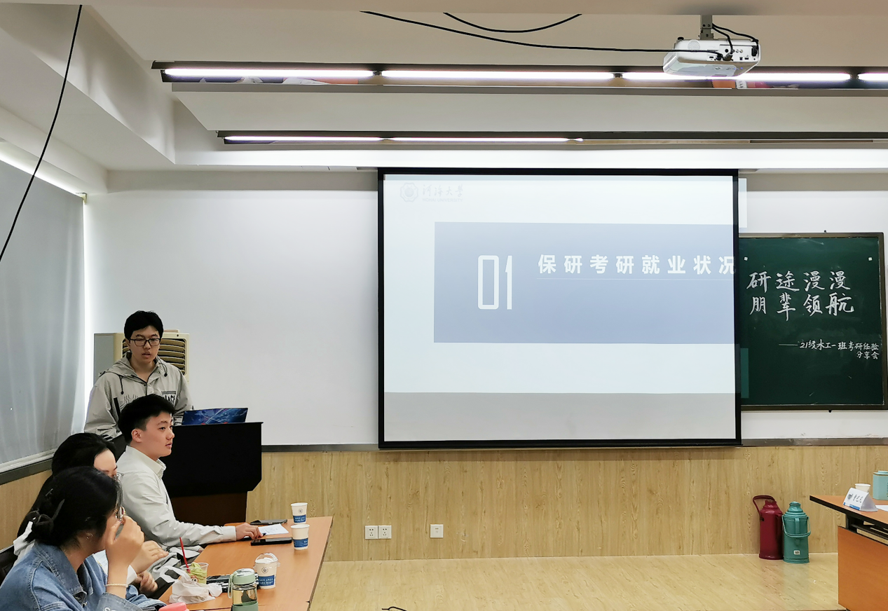 班长郭俊峰汇报班级整体情况,从绩点分布、英语四六级、计算机等级考试等方面展开,分析班级同学考研、保研、就业意向,展现出水工一班同学锐意进取的奋斗姿态。