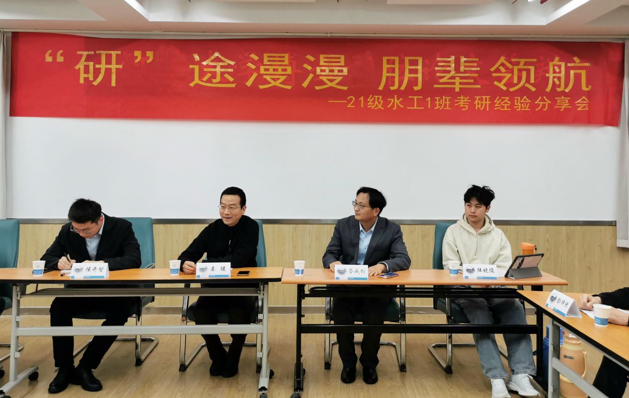 49日下午,娄健书记参加结对联系班级——2021级水工1班 “研途漫漫,朋辈领航”考研经验分享会,并与同学们座谈交流。班导师岑威钧老师、辅导员侯开智老师出席班会。本次班会邀请2021级研究生曹艺凡和廖承涛、2020级本科生陆晓俊、万梓强和彭帅然五位学长分享读研经验,班会由陈贤博主持。