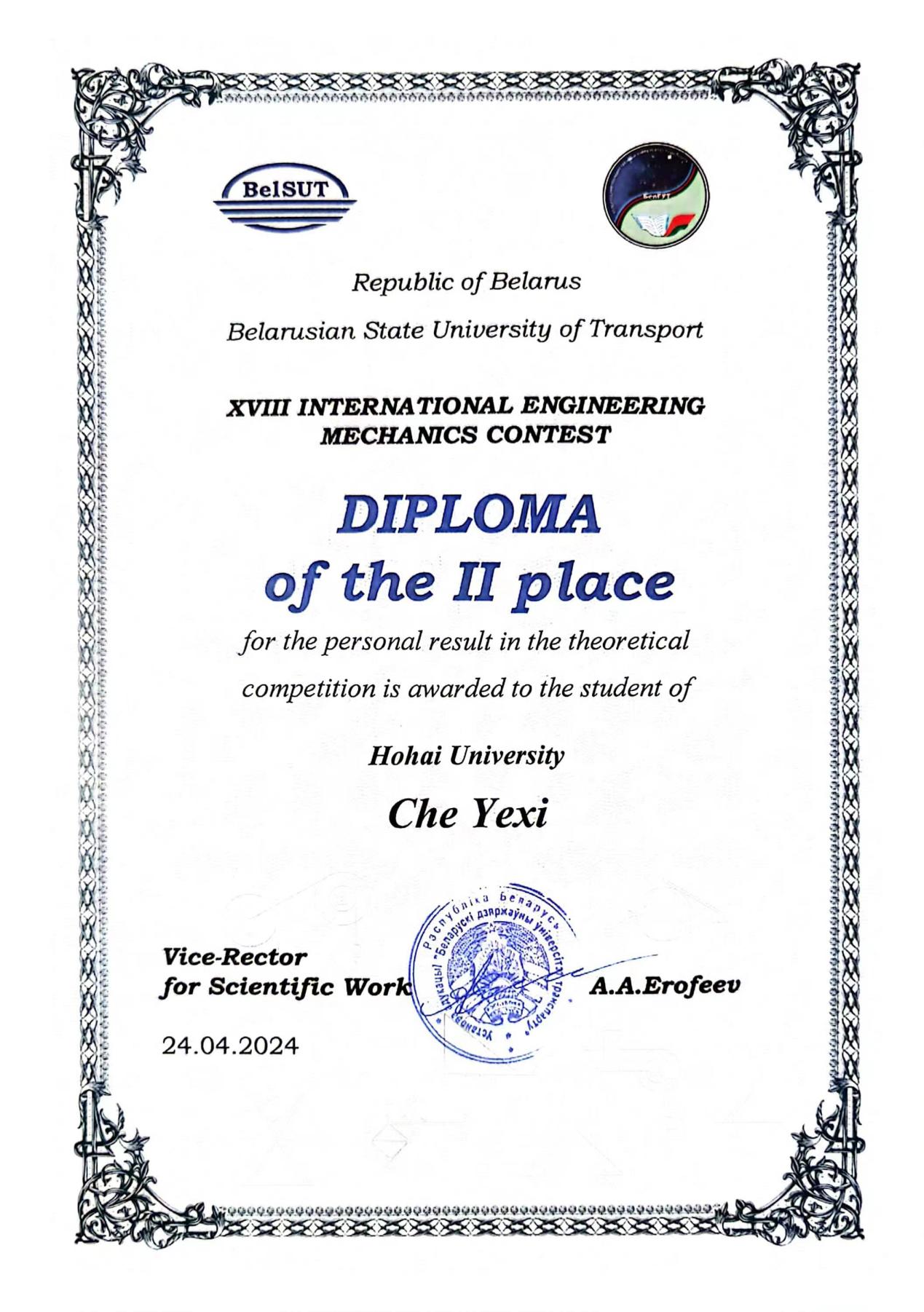 2021级本科生车烨晰同学参加了第十八届国际大学生工程力学竞赛,斩获个人赛银牌1枚。该赛事在白俄罗斯戈梅尔的白俄罗斯国立交通大学举行,来自中国、俄罗斯、白俄罗斯等多个国家共20余所高校100余位师生代表参加竞赛。据了解,去年12月车烨晰通过由91热爆