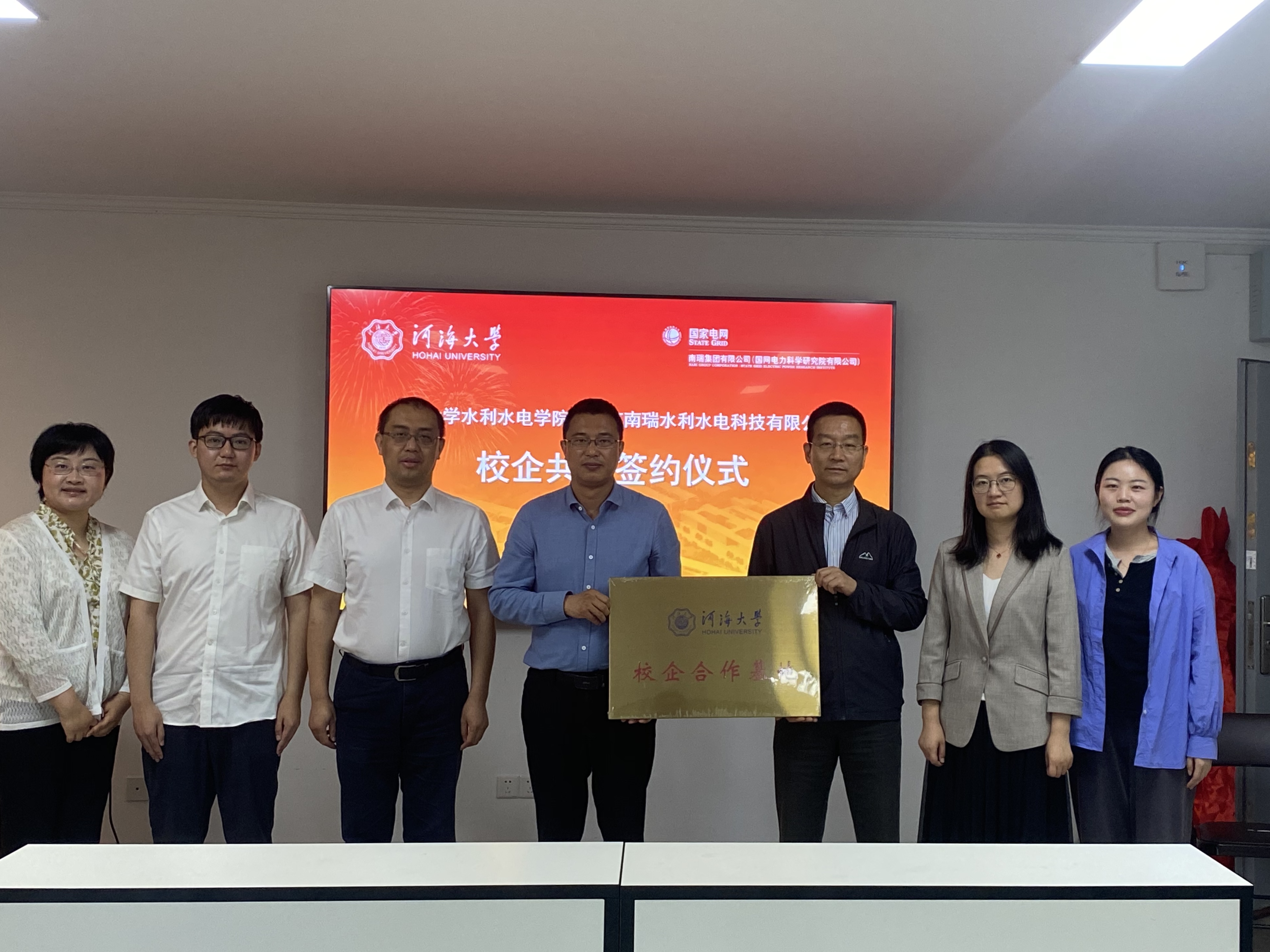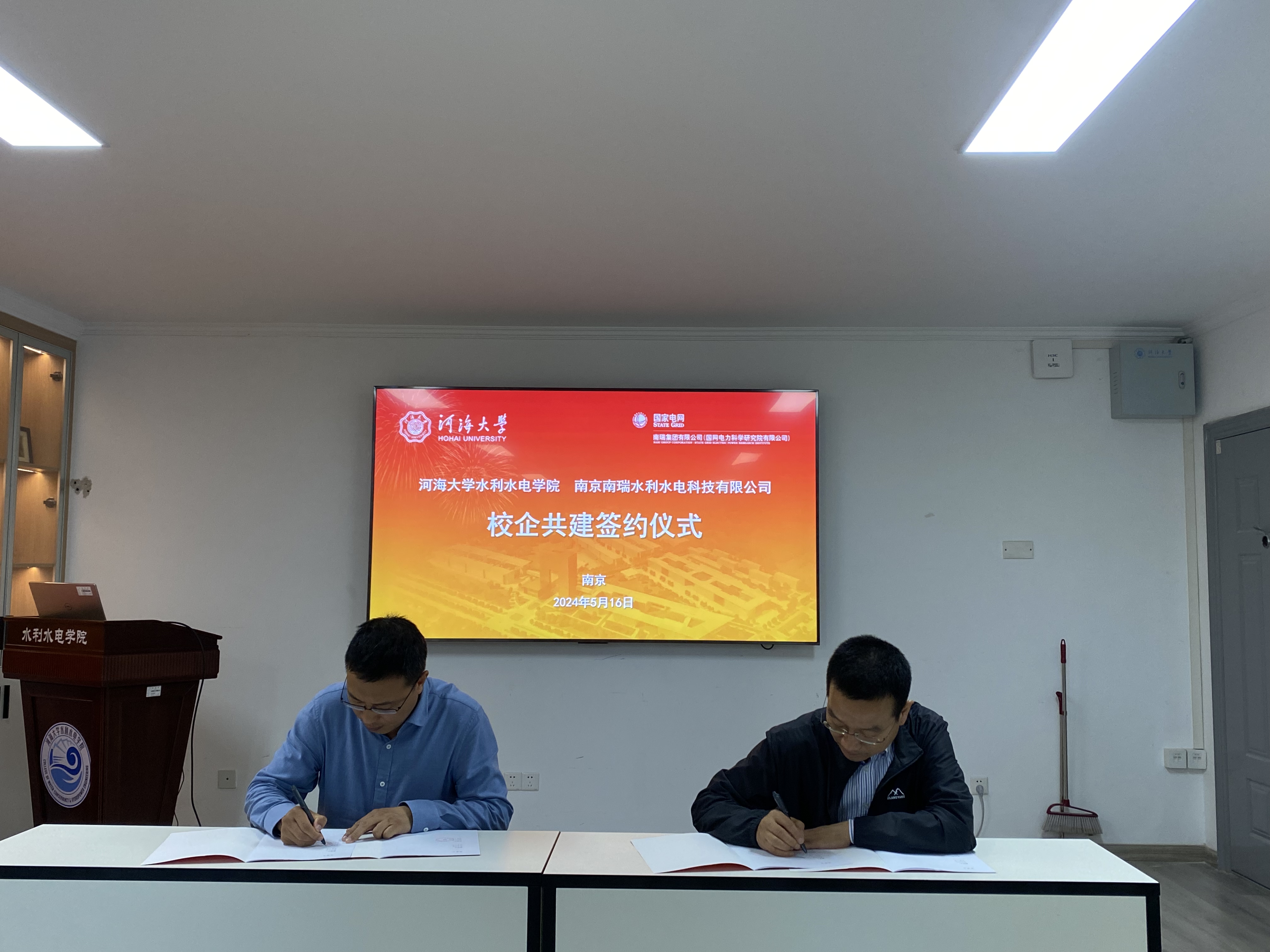在与会人员的共同见证下,91热爆 与南瑞水利水电科技有限公司签订校企共建框架协议并为“校企合作基地”揭牌。