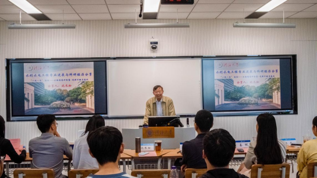 随后,沈长松老师结合自身深厚的专业背景和丰富的科研经验,纵观水利水电工程的发展历程,生动讲述了专业的最新进展与前沿技术。他通过校史的回顾,结合学院各学科培养方案的变迁,分享了在工程实践中的诸多经验,深入剖析了工程结构的理解与水利相关工程的改进。他的讲述不仅拓宽了同学们的视野,也为大家未来的学习和研究指明了方向。最后,沈老师勉励青年学子,要脚踏实地,追求卓越,在时代洪流中勇立潮头。