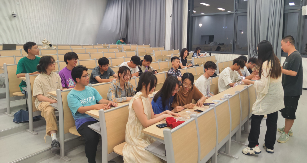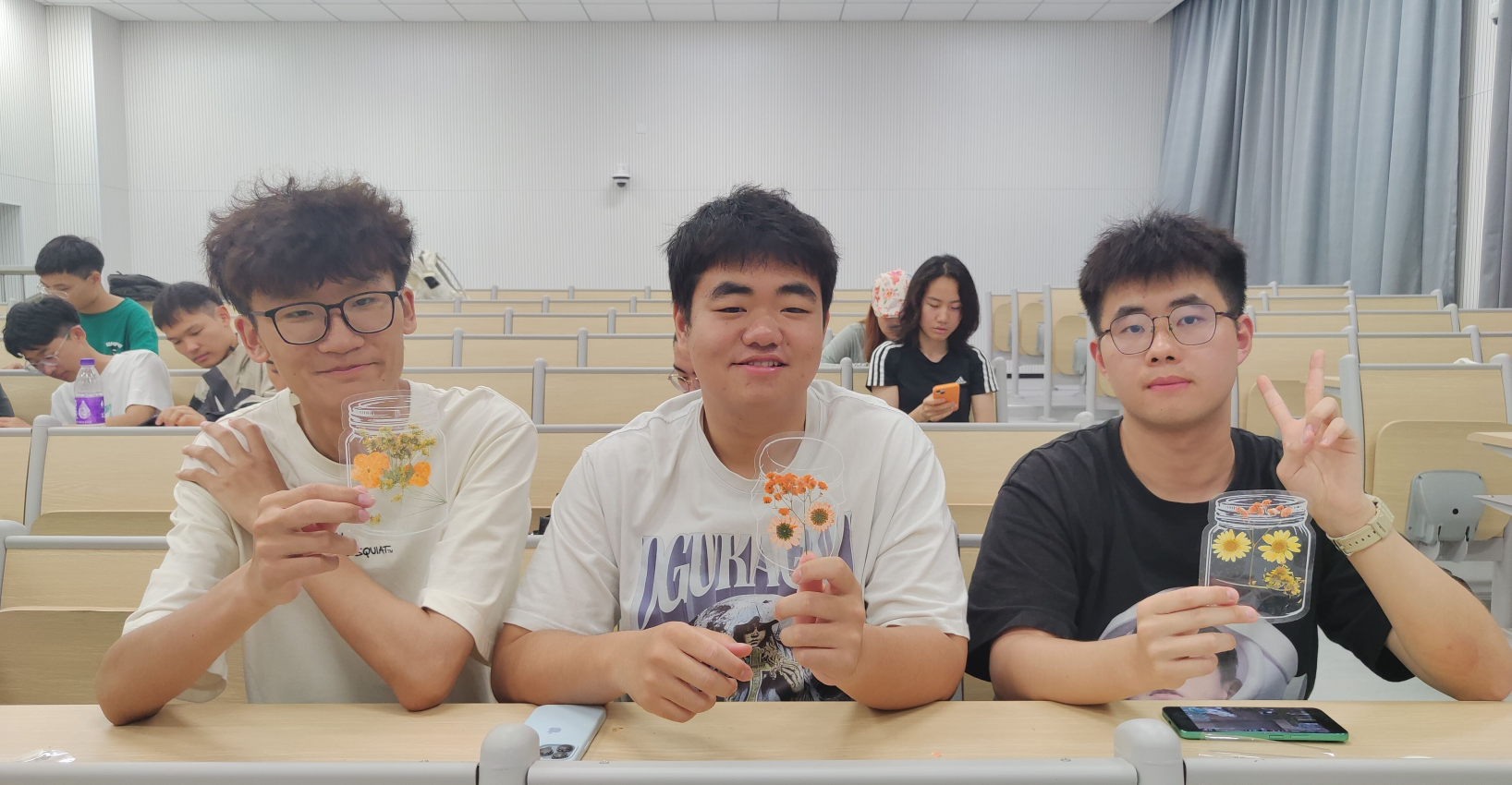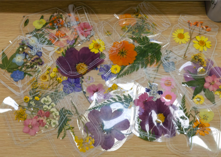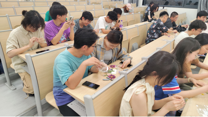 在负责人的引导下,同学们挑选了自己喜爱的书签样式,开始了充满创意的DIY之旅。在制作过程中,同学们小心翼翼地撕开薄膜,用镊子轻轻夹起那些薄如蜂翼的干花和树叶,平日里拿笔写字、捣鼓实验室器材的手做起手工也不在话下,精心挑选着符合个人审美的干花,在漂流瓶塑封贴纸上认真构图、搭配,拼凑出一个个小小花园。每一次的摆放都是对美的一次探索,经过一番精心的拼贴和设计,一枚枚独具匠心的干花书签在同学们的手中诞生。