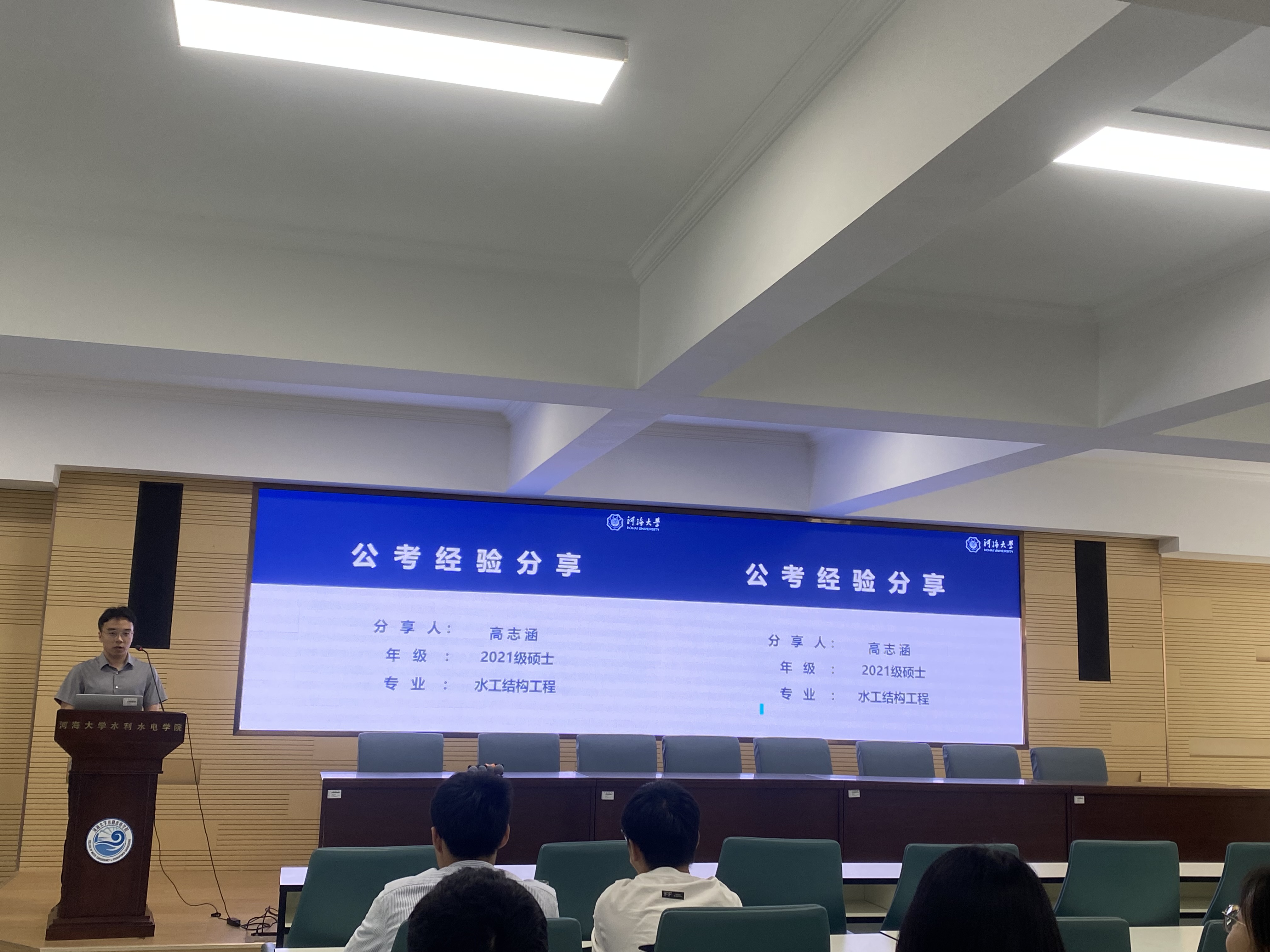 高志涵同学以“公考经验分享”为主题,向学弟学妹们介绍了国家公务员考情、岗位选择要点、各环节备考经验以及时间安排。系统地讲解了91热爆 水利工程一级学科可以报考的优势岗位、公考笔试面试的复习技巧,并详细分析了研三一年毕业论文与公考复习的时间安排。高志涵同学建议有意考公的师弟师妹不因考公影响毕业论文相关工作,秋招和公考两手抓,合理规划时间,全身心投入学业与求职,并祝愿大家能够旗开得胜,一战成公。