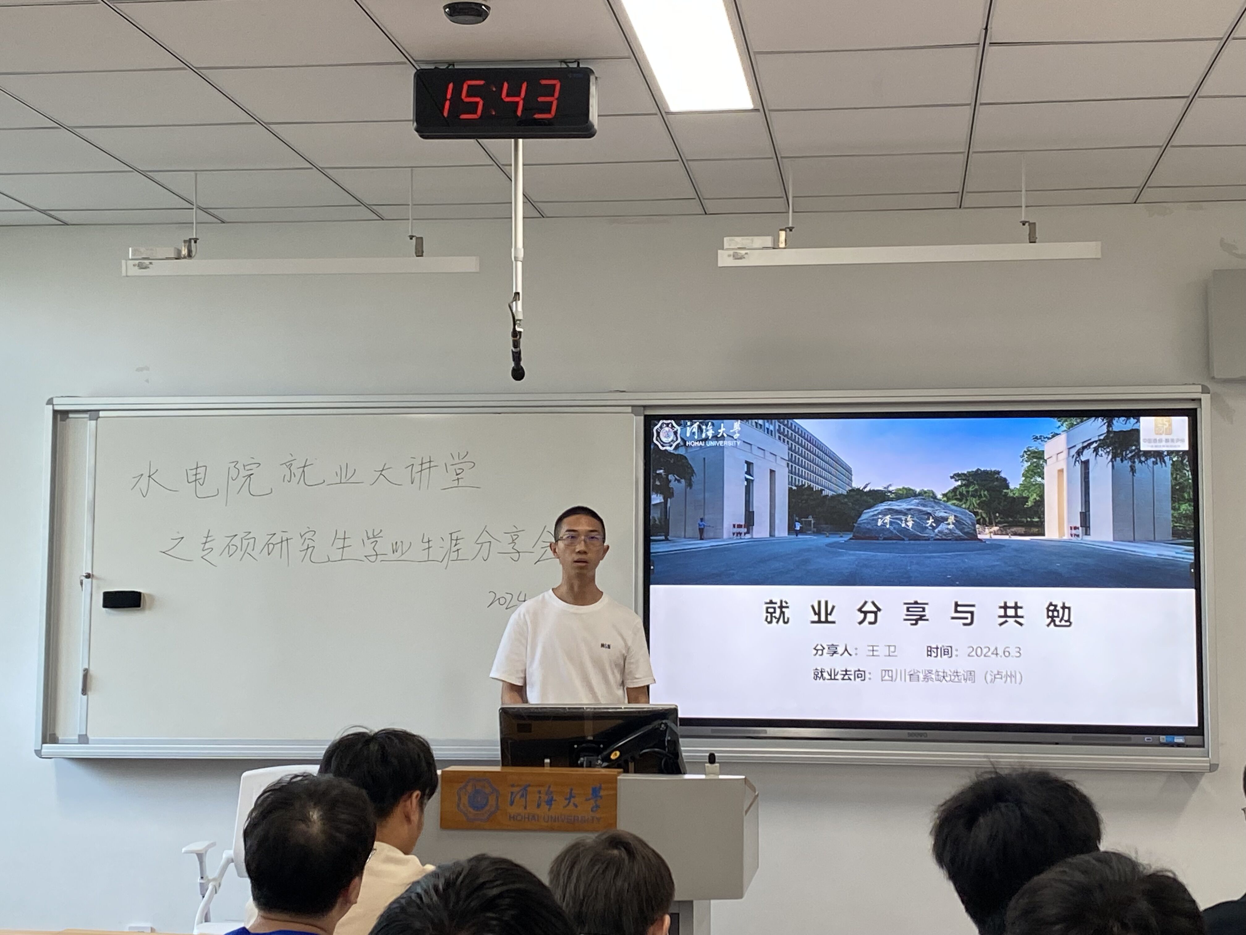 学院2023级专硕研究生即将前往研究生联培基地顶岗实习,为进一步引导同学们合理规划学习生涯,6月3日,学院在金坛校区举办水电就业大讲堂之专硕研究生学习生涯分享会。本次活动邀请了学院2021级土木水利专业罗天富、史焱威和王卫3位研究生师兄面向学院2023级土木水利专业研究生做分享,活动由辅导员陈辰老师主持。