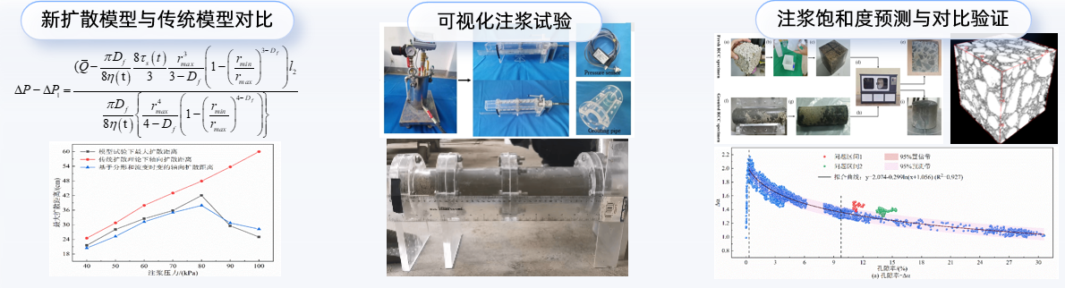 研究团队考虑孔隙分形特性、浆液流变时变和骨架颗粒渗滤的耦合效应,提出了改进的注浆扩散预测模型,并通过开发可视化加浆试验观测装置进行验证。研究证明,随着注浆压力的增加,浆液的最大扩散范围先增大后减小,揭示了从渗透注浆到压密注浆的关键灌浆压力,建立了注浆参数、施工窗口期选择、浆管布置等施工参数对注浆效果的馈控机制。