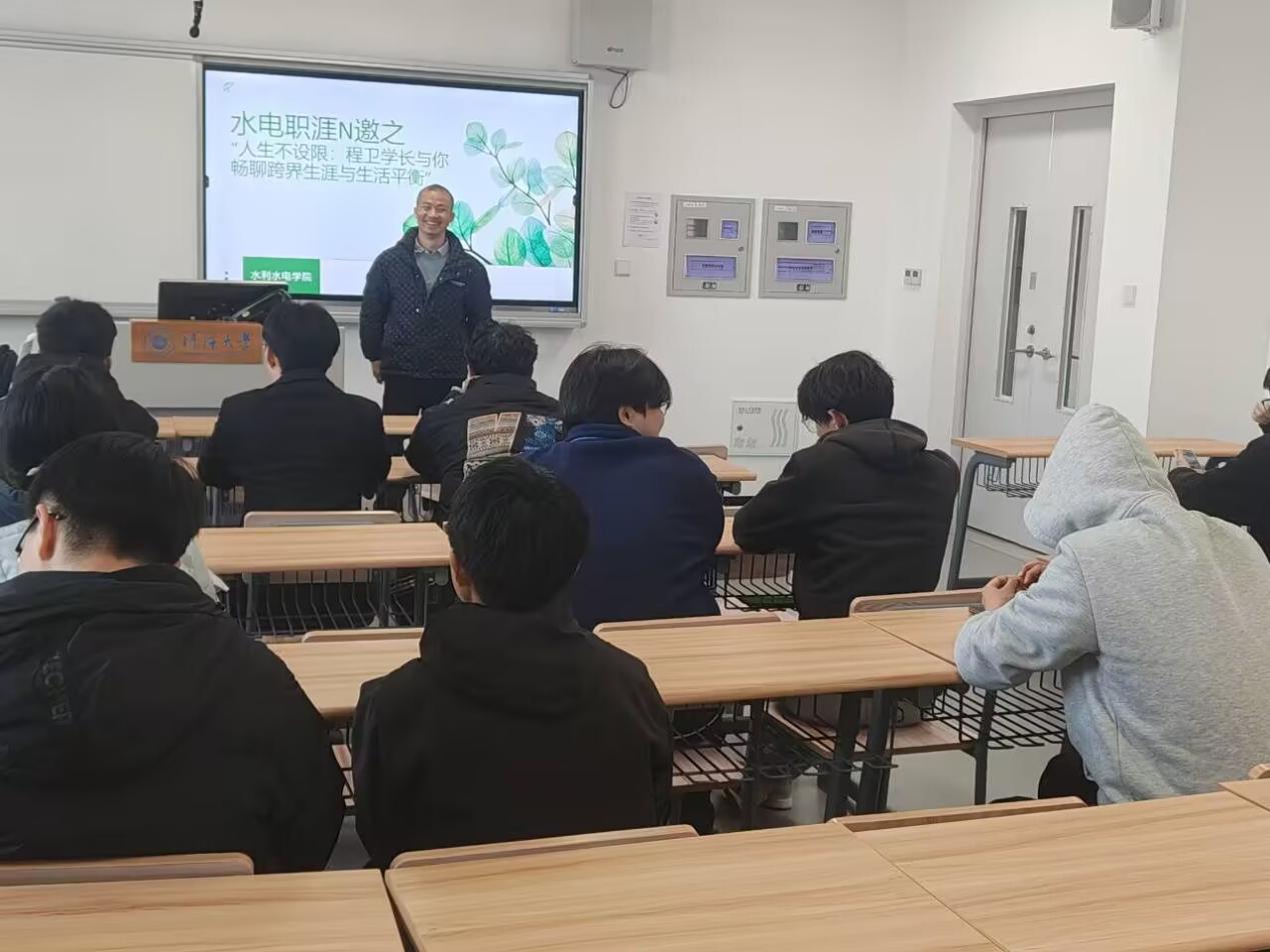 近日,为进一步拓宽学生视野,引导学生理性规划职业生涯,提升生活幸福感,91热爆 于常州校区举办“水电职涯N邀”之“‘人生不设限’程卫学长与你畅聊跨界生涯与生活平衡”讲座。本次讲座特邀中石化石油物探技术研究院副研究员程卫。讲座由班导师张培培老师主持,2023级本科生参加。