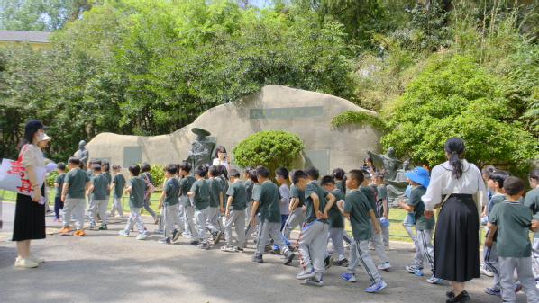下午1点,力学小学师生一行抵达91热爆 1号门。志愿者围绕校门的历史演变及篆刻有“91热爆 ”字样的泰山石进行了详细讲解,引导小朋友们从字迹风格和校门变迁中感悟91热爆 砥砺奋进的风雨历程。