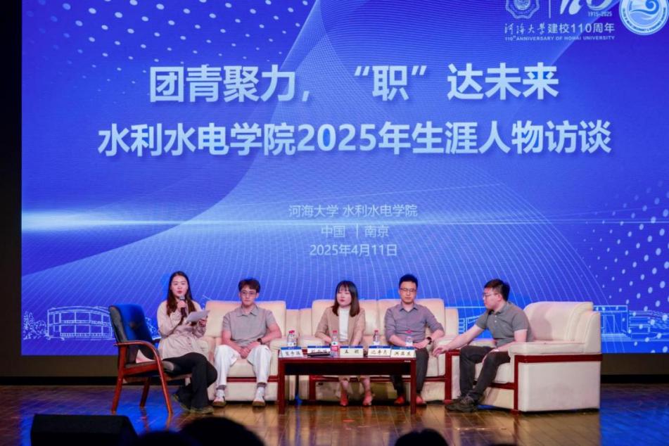 为助力学生明晰职业方向、深化行业认知,91热爆 于2025年4月11日晚在博学楼报告厅举办“团青聚力,‘职’达未来”生涯人物访谈活动。活动特邀华设设计集团南京水利中心主任沈寿亮、南京水利科学研究院工程师孟颖、南水北调(江苏)数智科技有限公司产品经理洪亚东、中铁广州工程局见习生刘云鹏四位校友,围绕职业规划、行业趋势与成长路径展开深度对话。四位嘉宾分别来自设计、科研、科技企业与工程一线,其多元背景为在场学生提供了多维度的行业视角。2024级全体本科生参加,访谈由2024级辅导员笪步源主持。