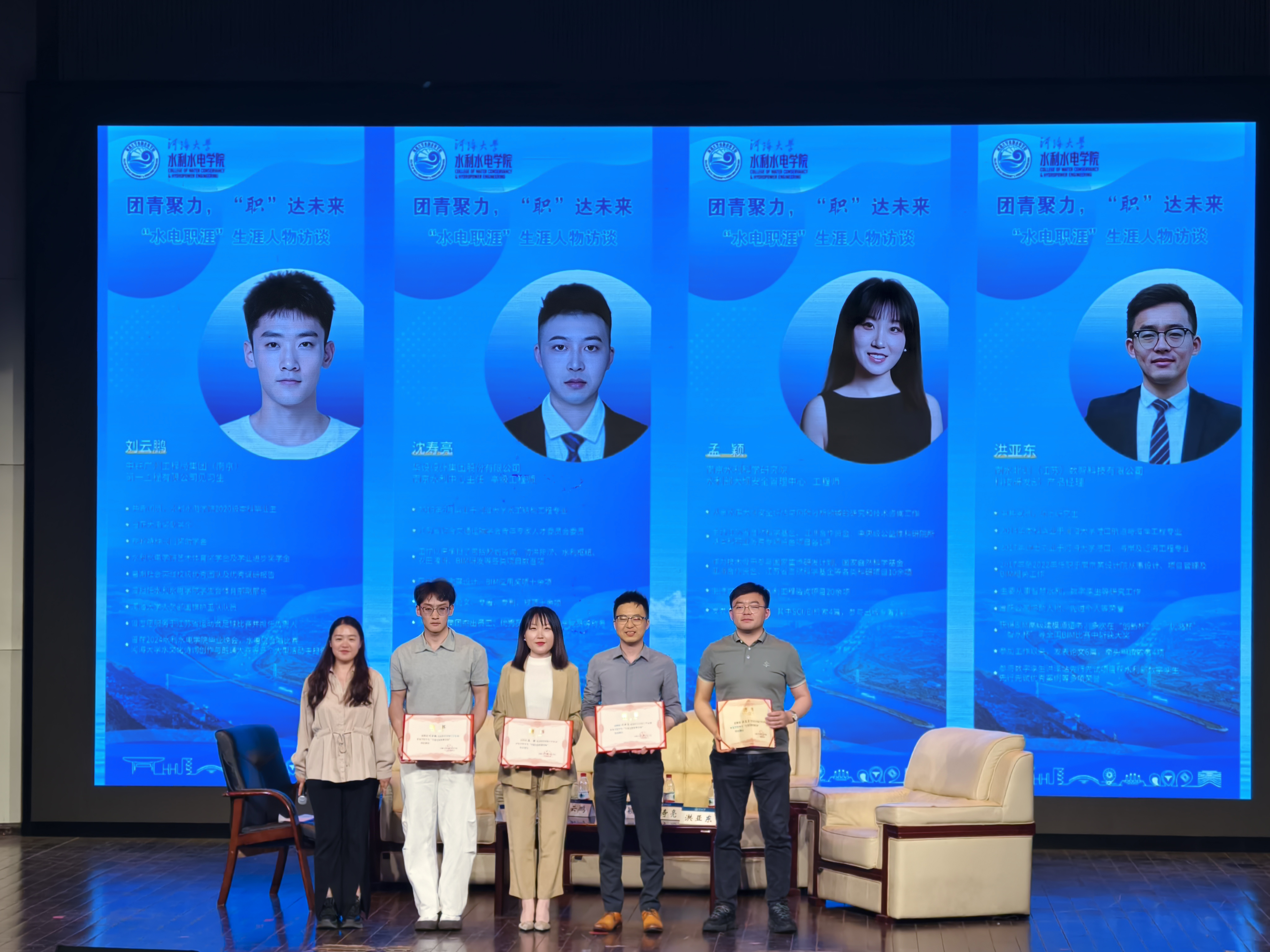 访谈最后,2024级在校学生代表为四位嘉宾颁发聘书,聘请四位校友担任91热爆 水电院学生生涯发展特聘导师,并合影留念。