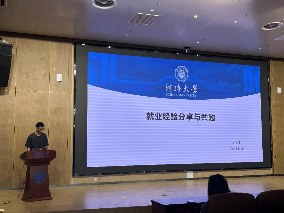 就业代表资文彬学长,他即将入职中国电建昆明勘测设计研究院,他分享了求职经历与实习体会,建议同学们尽早准备简历与面试,主动参与校企交流活动,增加实践机会。